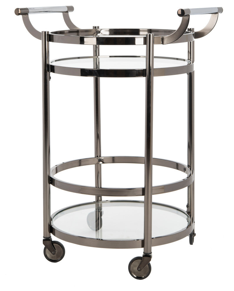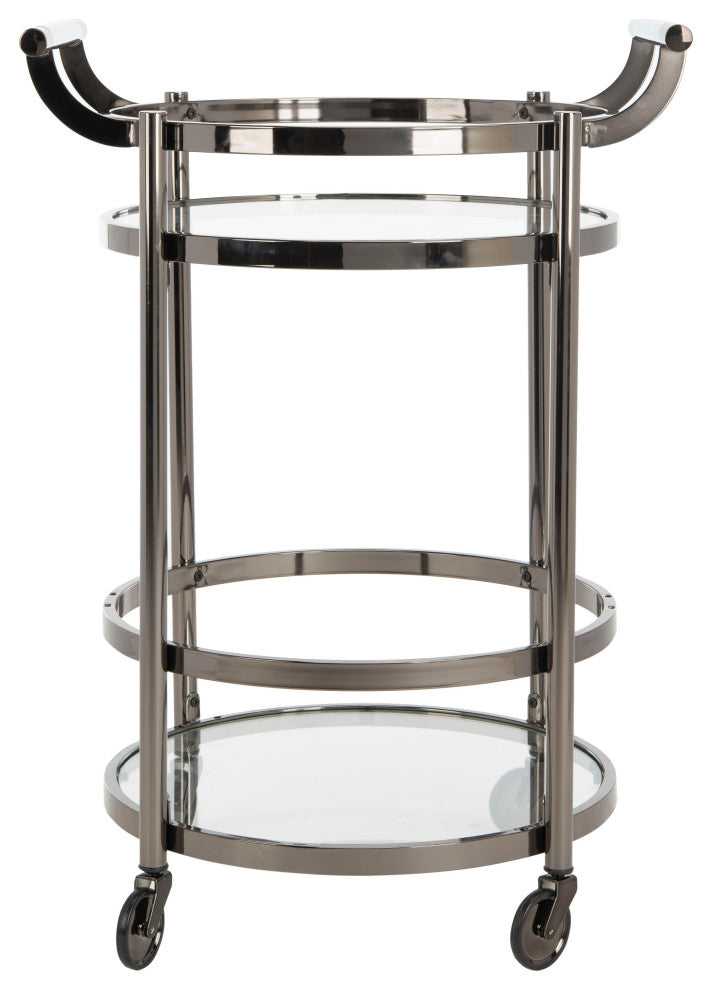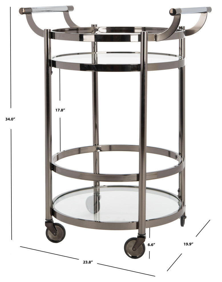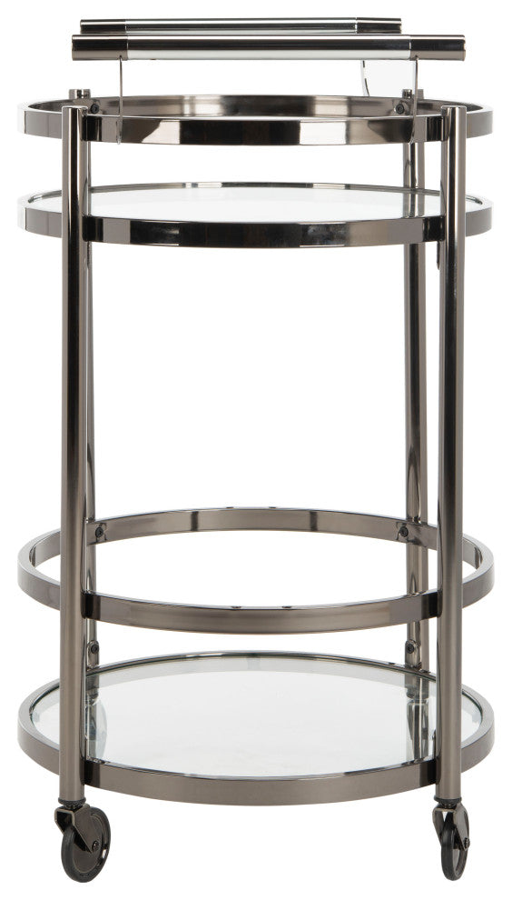 Designed with sleek, stylish curves, this contemporary 2-tier round bar cart ensures easy entertaining in any room. Its two glass layers and shimmering gunmetal finish create a stunning showcase for glasses and barware. It''s must-have for the modern host.