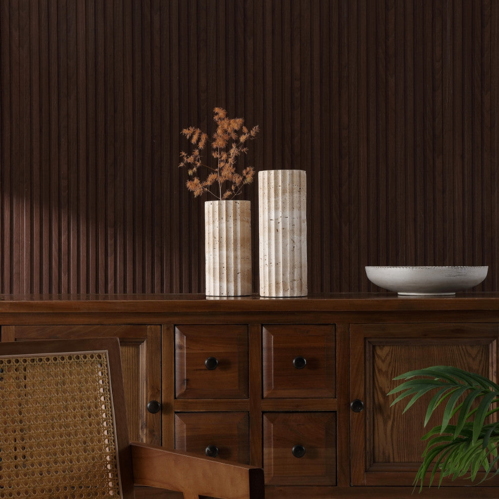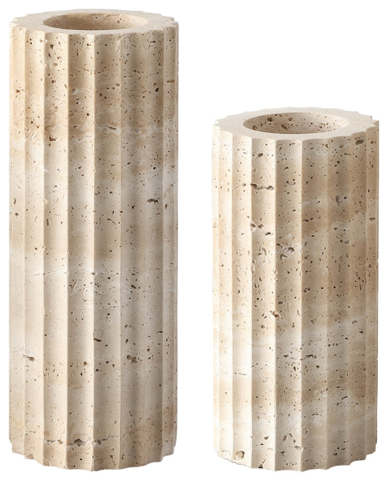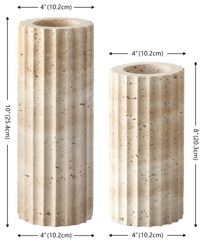 Introducing the Teroi Set of 2, a pair of beautifully crafted travertine vases that bring natural elegance to your decor. With their distinctive fluted design and organic texture, these vases offer a modern take on classic architectural forms. The neutral tones of the travertine stone highlight its natural speckling, adding subtle sophistication to any room. Whether displayed with greenery or as standalone pieces, the Teroi vases deliver an understated yet impactful aesthetic that complements both contemporary and traditional interiors.Small Dimensions: 4"x4"x8"Large Dimensions: 4"x4"x10"