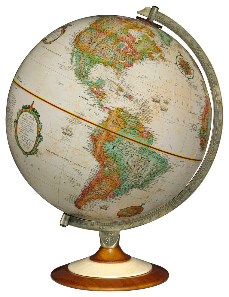 Thousands of place names include continents, countries, capitals, biggest/important cities, bodies of water and more. Raised relief cartography enhances our understanding of the contours of our world. Die-cast brass plated numbered semi-meridian (arch supporting the globe). Time dial is located at the North Pole.