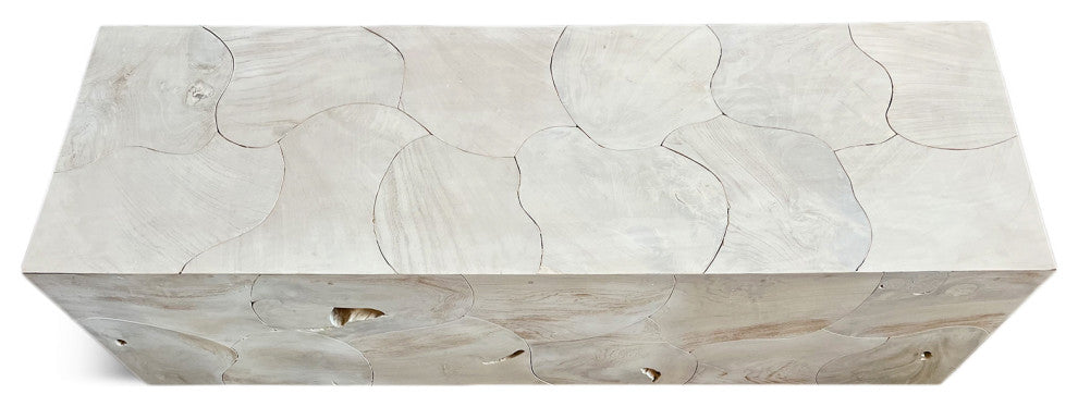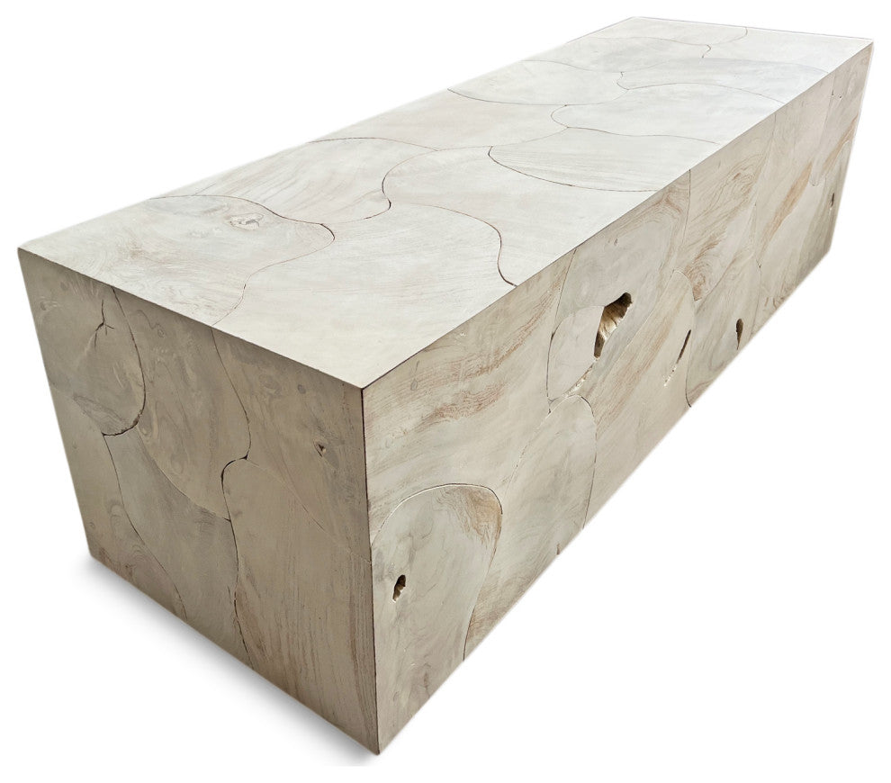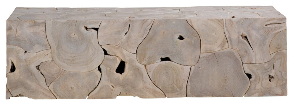 Salvaged teak root block bench / coffee table. Beautiful sun bleached washed finish. Each is wonderfully unique in exact finish, teak root formations, grain, and natural imperfections. This bench weighs approx. 90 lbs.