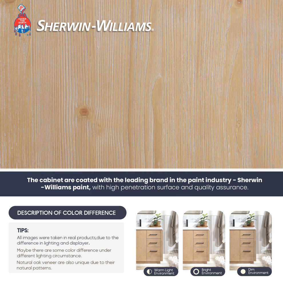 Our exquisite San Series Vanity is expertly crafted from premium hardwood, ensuring exceptional durability and a timeless aesthetic that never goes out of style. The natural grain of the wood adds warmth, texture, and character to your bathroom space, creating a seamless fusion of modern and classic design elements. Soft-closing drawers and cabinets provide you with easy, organized access to all your essentials.Features Durable Materials: Crafted from natural, imported solid wood for superior durability and long-lasting beauty.Stunning Finish: Available in your choice of a beautiful Fir Wood Brown,Natural Walnut or Washed Ash Grey finish to complement your decor,using environmentally friendly Sherwin-Williams paint products.Ample Storage Space: One soft-closing doors and three sturdy, soft-closing dovetail drawers offer ample space for all your toiletries. Built-in partition storage space in the drawer allow you to keep toiletries and other items neatly organized.High-Quality Hardware: Rugged zinc alloy knurled Matte Black or Brushed Gold handle adds a cool touch of style and contrast against the textured wood.Modern Top: 1"-thick, White grain composite stone top with backsplash lends a fresh and contemporary look. With a high-gloss, anti-fouling coating, the countertop is scratch-resistant, wear-resistant, and easy to clean.Nano-Coated Basin: Bright white Nano anti-fouling coating ceramic undermount sink with overflow blends seamlessly with the stone vanity top.Practical Functionality: Built-in UL-listed power and USB outlets offer a practical way to power beauty and grooming appliances.Includes convenient hair dryer organizer that keeps your favorite tool within easy reach.Matching Mirrors: Single, rectangular, aluminum-framed mirror complement the vanity and tie it all together. (Mirror Option)Faucet Type: Countertop has a pre-drilled, standard 1-3/8" faucet hole..Accessories: Does not include faucet, drain assembly or P-trap,Storage Cabinet. Comes fully assembled and ready to install in your bathroom.No Installation Required: Freestanding bathroom vanity (without back panel) comes fully assembled for your convenience.Designed for easy, no-hassle plumbing and faucet installation.Full Warranty: 1-Year Manufacturer Warranty-purchase with 100% peace of mind. Country of Origin: Vietnam