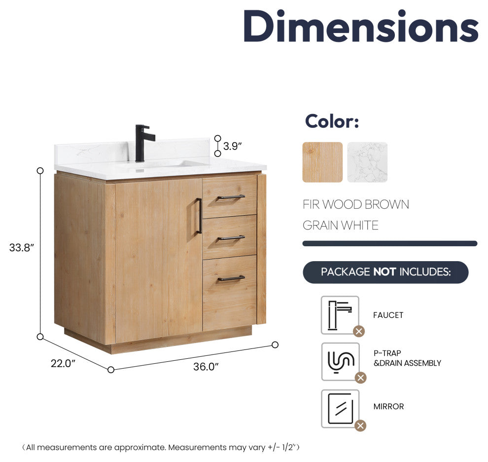San Bath Vanity with Stone Top, Fir Wood Brown, 36", Single Vanity, No Mirror
