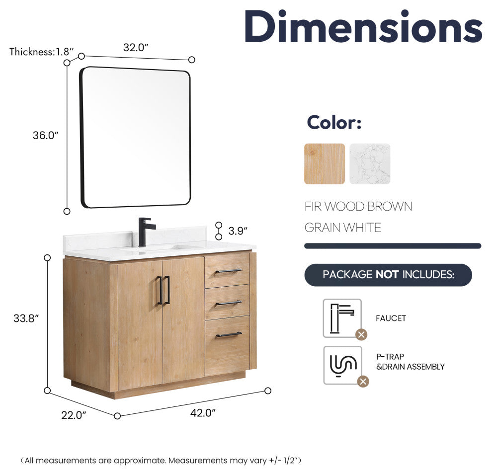 San Bath Vanity with Stone Top, Fir Wood Brown, 42", Single Vanity, With Mirror