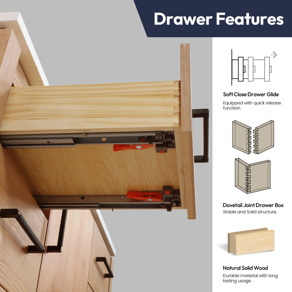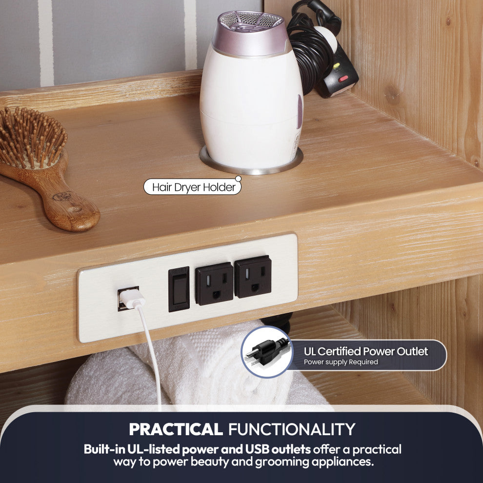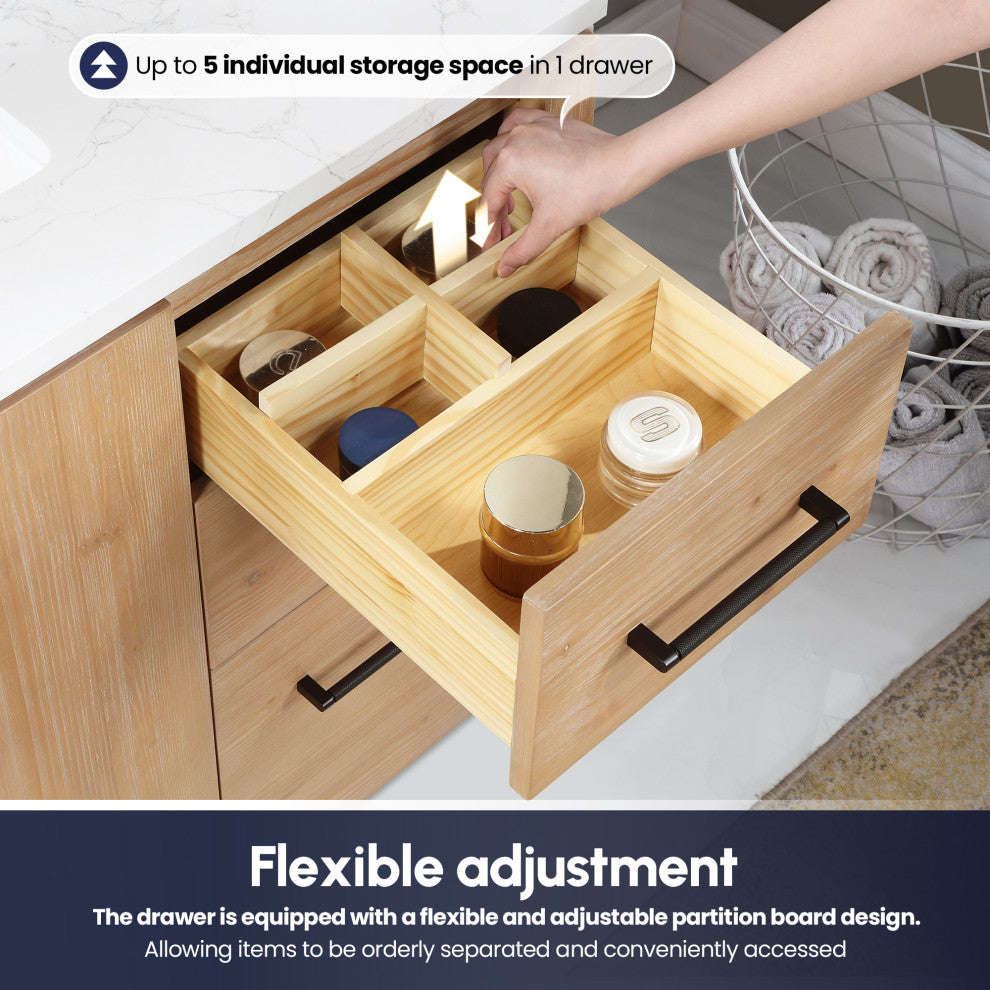 Our exquisite San Series Vanity is expertly crafted from premium hardwood, ensuring exceptional durability and a timeless aesthetic that never goes out of style. The natural grain of the wood adds warmth, texture, and character to your bathroom space, creating a seamless fusion of modern and classic design elements. Soft-closing drawers and cabinets provide you with easy, organized access to all your essentials.Features Durable Materials: Crafted from natural, imported solid wood for superior durability and long-lasting beauty.Stunning Finish: Available in your choice of a beautiful Fir Wood Brown,Natural Walnut or Washed Ash Grey finish to complement your decor,using environmentally friendly Sherwin-Williams paint products.Ample Storage Space: Two soft-closing doors and three sturdy, soft-closing dovetail drawers offer ample space for all your toiletries. Built-in partition storage space in the drawer allow you to keep toiletries and other items neatly organized.High-Quality Hardware: Rugged zinc alloy knurled Matte Black or Brushed Gold handle adds a cool touch of style and contrast against the textured wood.Modern Top: 1"-thick, White grain composite stone top with backsplash lends a fresh and contemporary look. With a high-gloss, anti-fouling coating, the countertop is scratch-resistant, wear-resistant, and easy to clean.Nano-Coated Basin: Bright white Nano anti-fouling coating ceramic undermount sink with overflow blends seamlessly with the stone vanity top.Practical Functionality: Built-in UL-listed power and USB outlets offer a practical way to power beauty and grooming appliances.Includes convenient hair dryer organizer that keeps your favorite tool within easy reach.Matching Mirrors: Single, rectangular, aluminum-framed mirrors complement the vanity and tie it all together. (Mirror Option)Faucet Type: Countertop has a pre-drilled, standard 1-3/8" faucet hole..Accessories: Does not include faucet, drain assembly or P-trap,Storage Cabinet. Comes fully assembled and ready to install in your bathroom.No Installation Required: Freestanding bathroom vanity (without back panel) comes fully assembled for your convenience.Designed for easy, no-hassle plumbing and faucet installation.Full Warranty: 1-Year Manufacturer Warranty-purchase with 100% peace of mind. Country of Origin: Vietnam