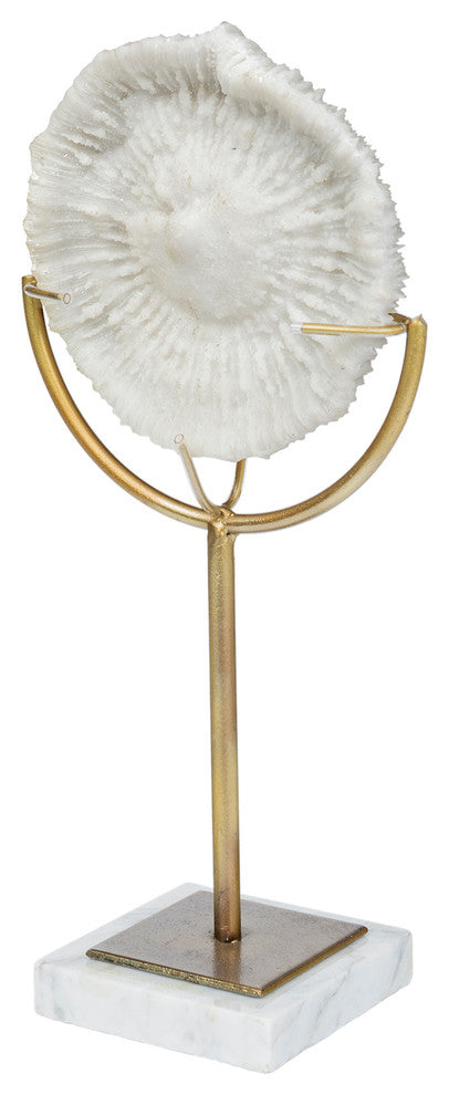 Sandy is a series of resin sand dollars displayed in a stylish yet minimalist metal stand. They look great on their own but even better with all 3 sizes.12.4" High ObjectThe Sandy object, measuring 6.1" long by 3.1" wide by 12.4" high, is a beautiful piece that adds a trendy accent to your space. Resin ConstructionThe Sandy, a sand dollar inspired object crafted from resin, is a beautiful and unique addition to your space. Superior FinishThe Sandy is finished in a white and gold polish, making it a stunning object that is sure to be the perfect accent in your space. Coastal Inspired DesignFeaturing a stunning design that flaunts clean lines and subtle curves, this object makes for a gorgeous addition to spaces based on the coastal design style. No Assembly RequiredDelivered pre-assembled and ready to display, this object allows you to add a beautiful touch to your space in no time.