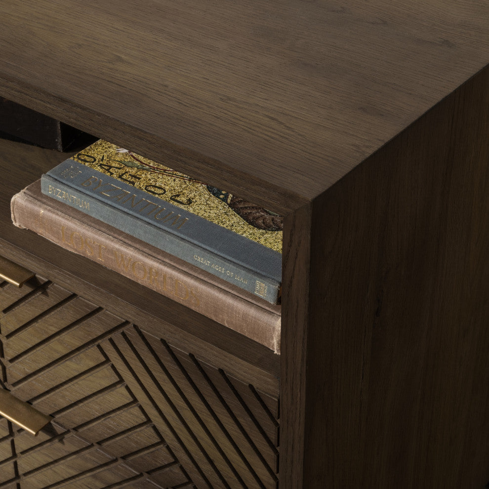 Designed with style and built for function, this nightstand brings sharp, sophisticated design into any space and offers two spacious drawers of storage. Modern geometric carvings, vintage brass pulls, and the classic look of oak dress up a minimalist silhouette, creating a bold look that suits any decor.
