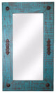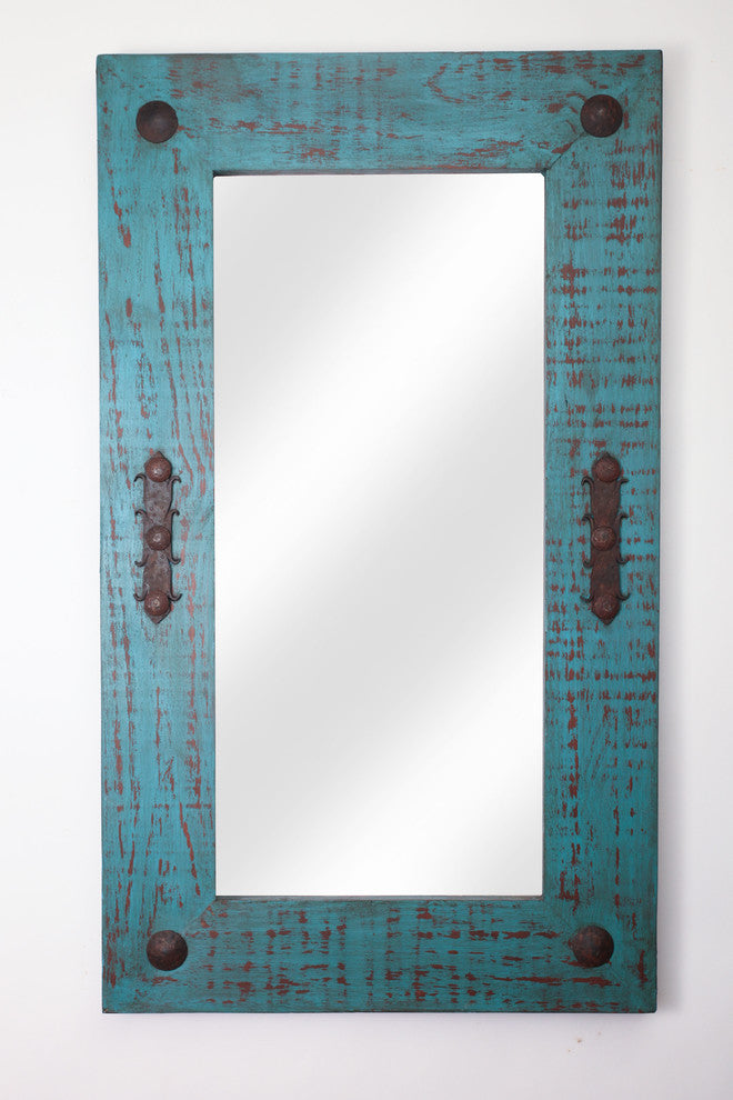 We take pine wood to create this unique mirror. It is then accented with hand hammered iron hardware to finish it off. It is distressed in an antiqued turquoise and brown tone. You can hang this mirror vertical or horizontal simply by moving the sawtooth hanger.