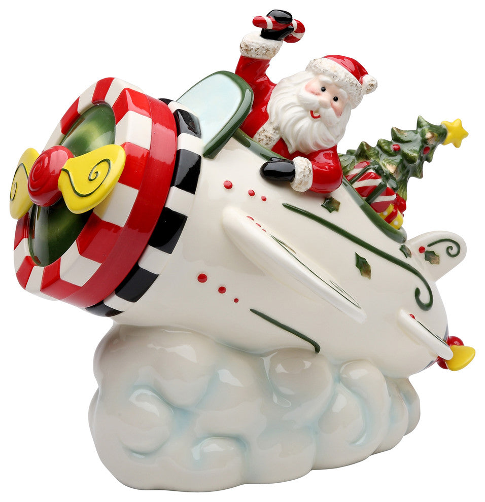 Decorate a side table or coffee table with the Santa With Airplane Cookie Jar. Made from ceramic with colorful hand-painted details, this decorative Santa jar is elegant and festive. Lid opens at the airplane''s engine. Fill it with candy or chocolate to surprise guests. Hand wash only.