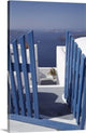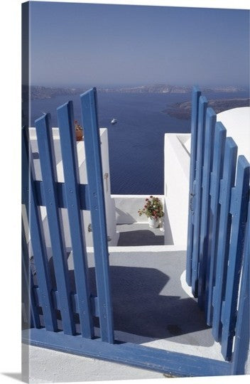 Gallery-wrapped canvas entitled, "Santorini Greece".Photograph of buildings and ocean in the distance seen through open gate.Our wrapped canvases feature a proprietary design that prevents warping or sagging over time. By using archival inks and artist-grade canvas, our premium canvases are sure to add that extra touch to any space. Lastly, our canvases are finished with a closed back that incorporates pre-installed hanging hardware for easy installation.