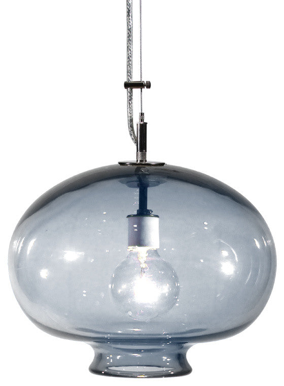 Hand-blown glass pendant by designer Joe Ginsberg. Each pendant in this collection is unique and will vary slightly due to the handmade process of glass blowing. The lighting fixture includes nickel plated hardware with a 5 inch canopy; 6 ft. braided steel electrical cord and an Edison-style Filament bulb. 60w; 120v. Made in the USA.