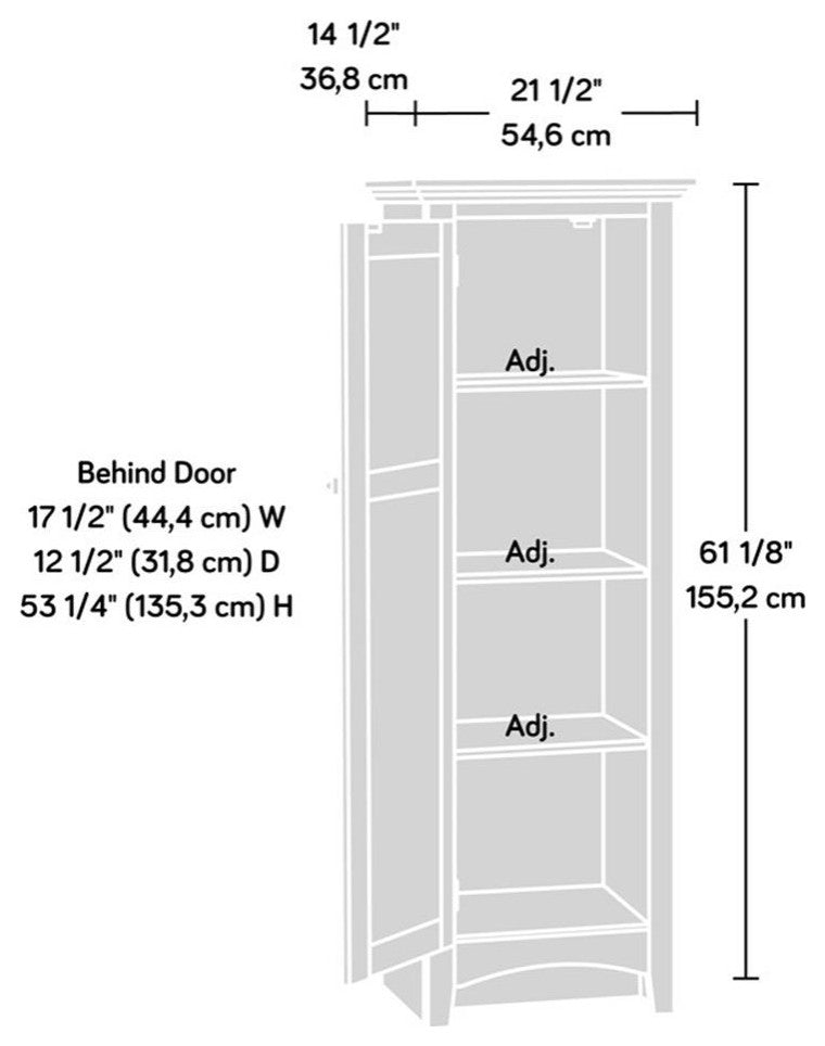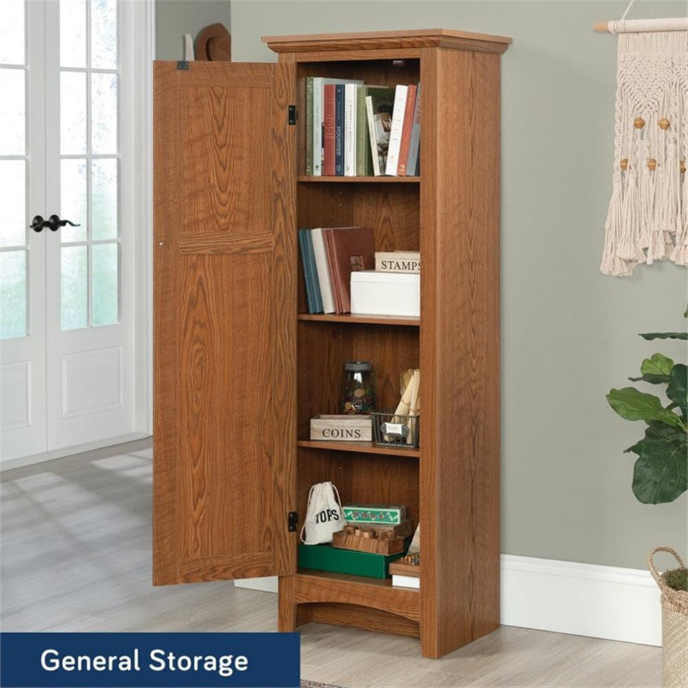 Create classic style and functional storage with this pantry cabinet from the Sauder Select collection. Contain supplies for crafts and hobbies or bathroom toiletries and necessities behind the beaded, framed panel door of this narrow storage cabinet. Three adjustable shelves provide versatile space to store anything from kitchen pantry supplies to fluffy bathroom towels. The adaptable shelves of this single-door storage cabinet provide various customizable options so there is always room for bottles of laundry soap or cereal boxes of varying heights and widths. Perfect for a variety of general storage needs, this utility cabinet is the perfect spot to hide away pet supplies for man''s best friend. Featuring a magnetic latch on the inside of the door, pantry items will always be secure. Finished in Carolina Oak®, adorned with decorative hardware and detailing, this engineered wood storage cabinet adds style and functionality to the entryway, kitchen, laundry room, or anywhere stylish storage is needed. Features: • Carolina Oak finish. • Material: Engineered Wood • MULTI-ROOM STORAGE "“ This functional cabinet can meet your storage needs in a variety of rooms "“ living room, kitchen, utility, or bathroom. • ADJUSTABLE SHELVING "“ Three adjustable shelves for the ultimate storage versatility. Each adjustable shelf has a maximum weight capacity of 25 lbs. • SAFETY FIRST "“ Wall anchor kit provided to help prevent tip-over accidents. • CLEAR INSTRUCTIONS "“ With illustrated instructions and labeled parts, you"™ll set it up quickly and easily. • SAUDER® TRUSTED SERVICE "“ For questions about product or assembly, we are here to help.Specifications: • Product Dimensions: 61 1/8" H x 21 1/2" W x 14 1/2" D • Product Weight: 86 lbs. • Weight Capacity: 25 lbs