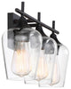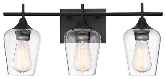 No bulbs included. The Octave 3-light bath bar from has understated elegance. It features large curved shades of clear glass, minimal detailing and an English bronze finish. Fixtures may be mounted as either uplight or downlight. No UL Availability at this time.