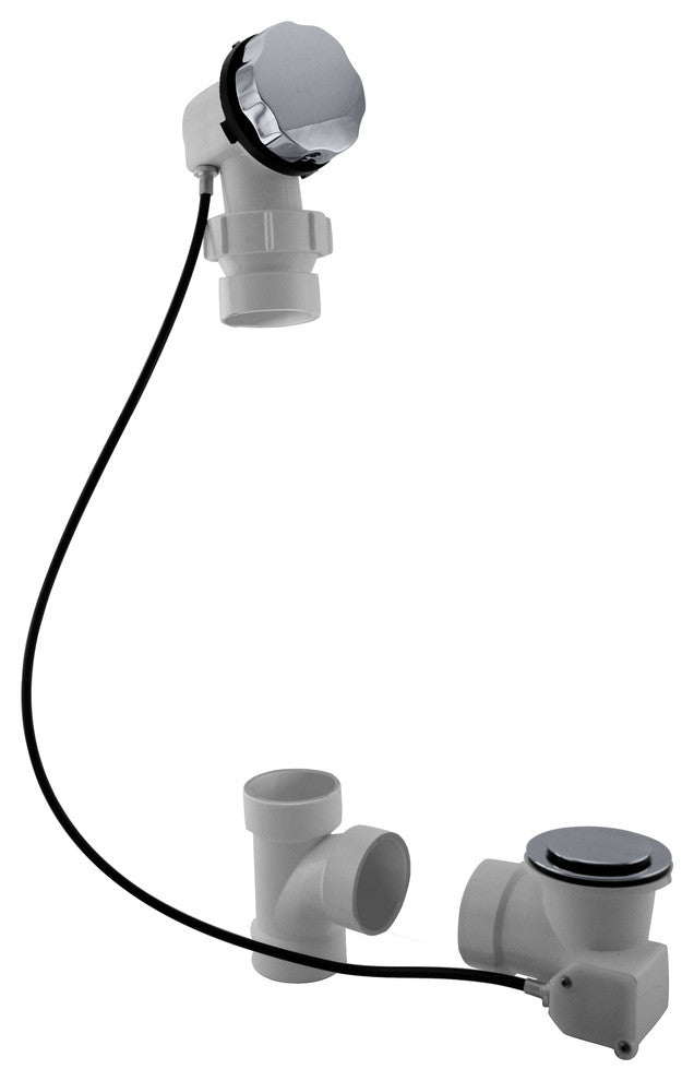 Westbrass D50A35BJ Schedule 40 PVC Cable drive bath waste with 35-Inch Cable and ball joint top elbow for tub adjustability. 1-1/2-Inch Schedule 40 PVC Cable Drive Bath Waste uses all Glue Type fittings - Tubes Not Included. Rotate overflow handle to close drain. Turn back to open.