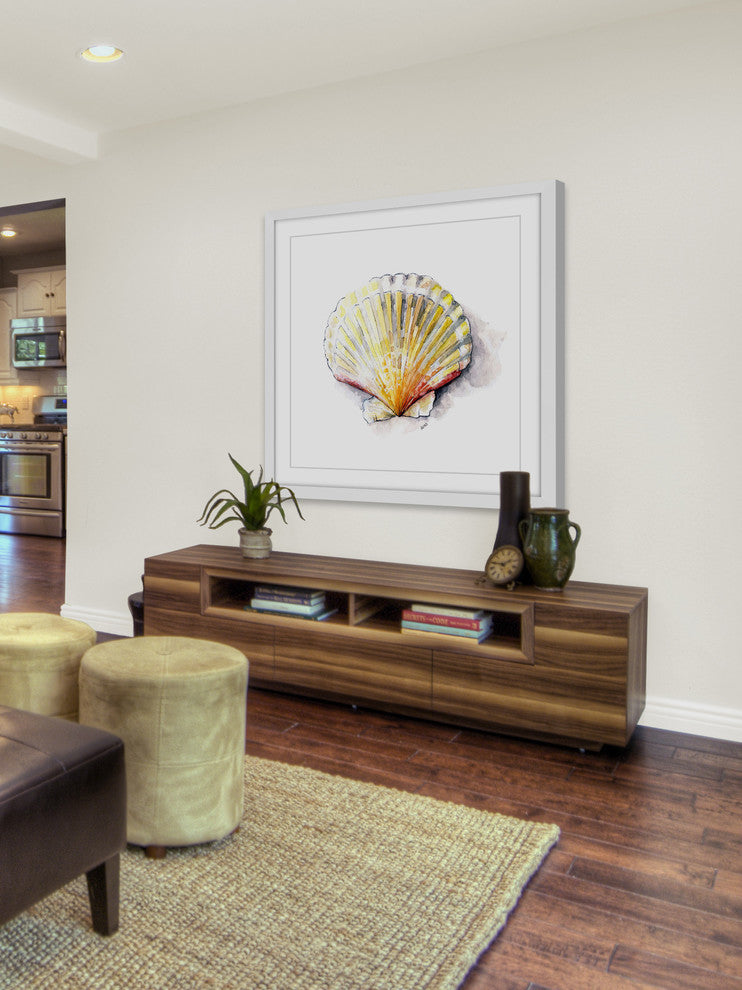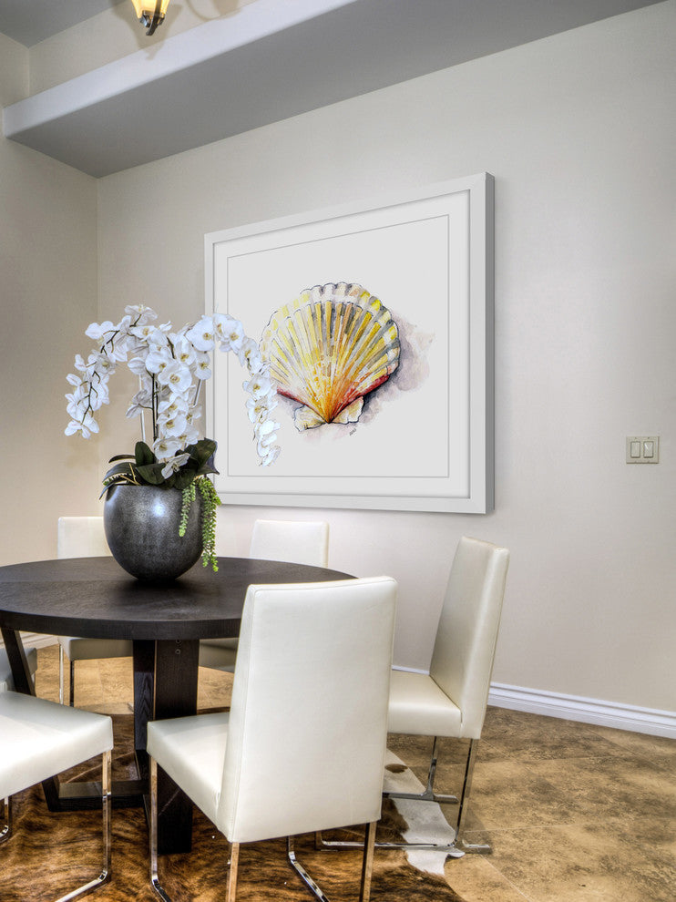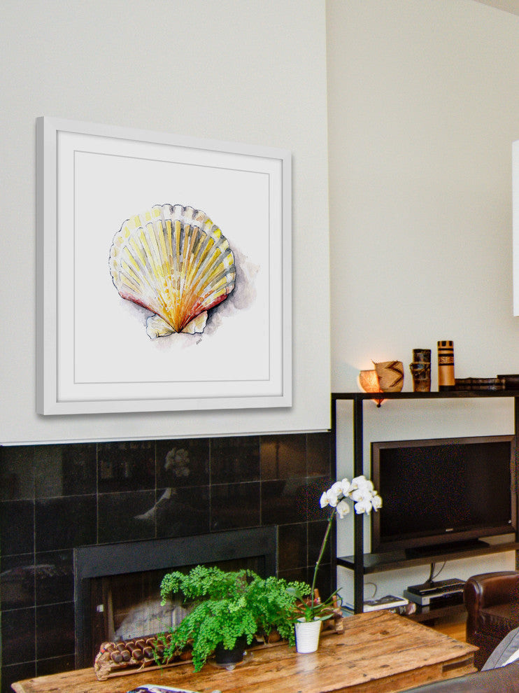 "Sea Scallop" Framed Print by Rachel Byler features vivid tones and supple artistry. Mounted in a gorgeous frame, this 24 inch wide by 24 inch tall piece will be an exceptional addition to any room. Top quality Giclee print on high resolution Archive Paper Artwork by Rachel Byler Professionally framed and mounted on acid free archive matte High quality durable non-warping frame Arrives ready to hang Includes a certificate of authenticityMade in the USAArtist signature on the front