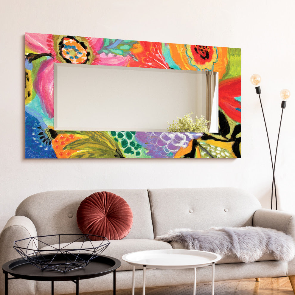 Introducing the "Secret Garden Floral II" Frameless Reverse Printed Tempered Art Glass Mirror, an exquisite piece that encapsulates the essence of a stroll through an exotic floral garden, blossoming with vibrant red, orange, yellow, blue, and pink shades, reminiscent of artist Karen Fields'' impressionist art. This mirror beautifully reflects the lush, flower-filled scene, adding a captivating touch to your space. The entire beveled Tempered Art Glass has dimensions of 72" x 36" x 0.4", with a beveled central mirror that sits on the glass measuring 55"x 20", leaving a Tempered Glass Frame of 8" wide. This extraordinary piece of art comes with a pre-installed hanging system, featuring four sawtooth hanging plates for seamless horizontal or vertical positioning. Alternatively, it can be safely leaned against the wall for a dramatic look.