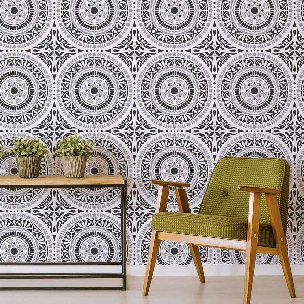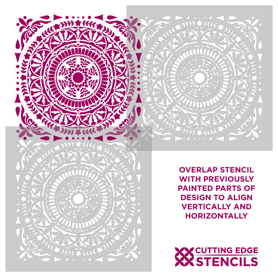 Try wall stencils instead of expensive wallpaper! Cutting Edge Stencils offers the best stencils for DIY decor - stencils expertly designed by professional decorative painters Janna Makaeva and Greg Swisher who have over 20 years of painting experience. We are a reputable stencil company that stands behind its high quality product. We are honored to have your 100% positive feedback.Our Segovia Tile stencil is a fantastic choice when you need a large stencil pattern for your accent or feature wall. This tile stencil was named after a beautiful city in Spain and inspired by Spanish majolica tiles and hand-painted ceramic tapas plates. Spanish tile design is revered as some of the most decorative, with stylized natural elements that lend themselves perfectly to stencil patterns. Tile wallpaper look is very popular today and our Segovia tile stencil will help you to achieve a trendy look without spending mega $$.SIZE/DETAILS: Free Stencil ! Single overlay stencil.Sheet: 23.6" x 24.6", Design: 20.6" x 20.6"Medallion is 19.25" in diameterThis stencil features an easy registration system, just use the previously painted pattern to align the stencil, check that it is level and continue. This gives you a seamless "wallpaper" look. Don''t worry about super perfect alignment: in the end your eye will never ever notice if it''s a little bit off. We decorative pros "fudge" allover patterns all the time! The walls in most houses are often not straight, so some "fudging" while stenciling helps a lot. Align the pattern the best you can, level it and roll away. Your eye will never notice the discrepancy. Just make sure not to double-roll the parts that were already stenciled.We proudly make our own stencils in the U.S.A.! Detailed Stenciling instructions, color photo and a Free Stencil included with each order. Stencil comes in attractive packaging and makes a great gift!Our stencils can be used on walls, floors, ceilings, as well as furniture! Did you know you can stencil on fabric too? With proper technique, you can easily create custom stenciled curtains, pillows and tablecloths!Some wall textures are really rough, with huge "peaks and valleys" and, if this is your case, stenciling may not be an option. However, there are light to medium textures that are very suitable for stenciling.•  This listing is for the stencil only. No furniture, paint, or other decor items are included in this listing.