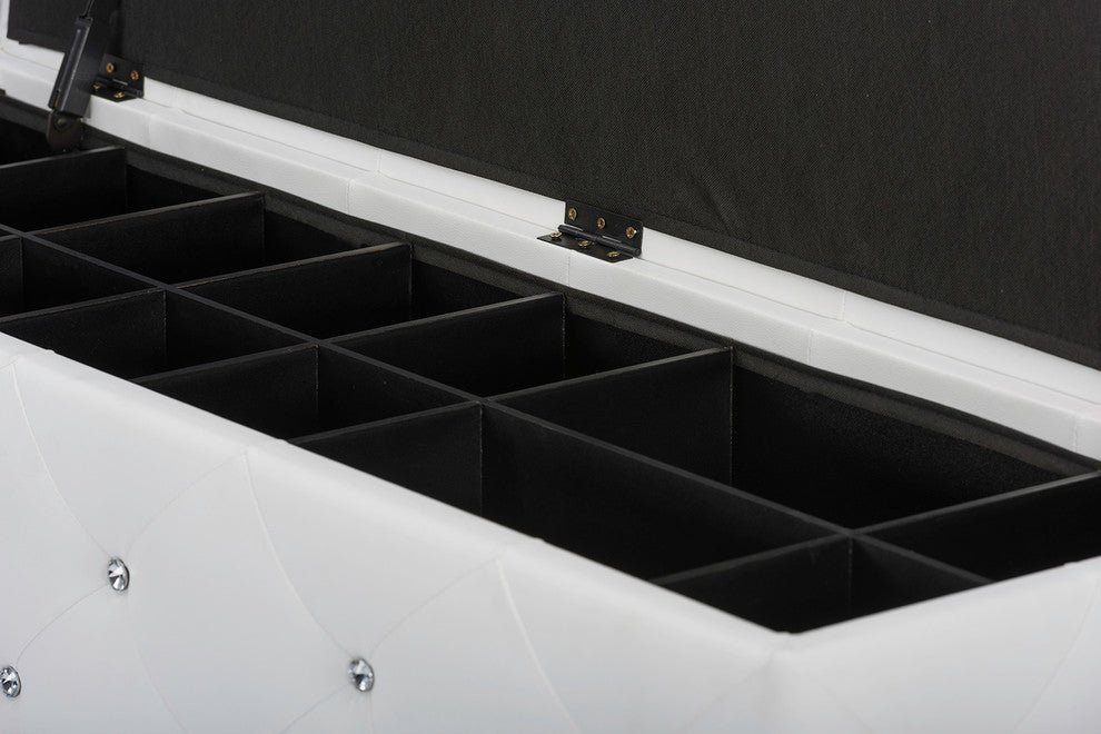 Cushioned, chrome and contemporary, our Seine Wood and Leather Contemporary Storage Ottoman celebrates style while offering plenty of storage space via its divided compartment. Sporting continental flair with its handsome crystal-tufted faux-leather upholstery and contoured chrome legs, the Seine ottoman s cushioned top provides seating or a comfortable footrest.