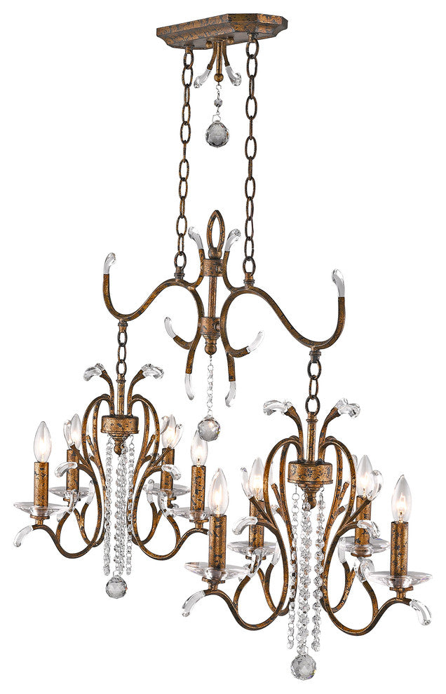 The delicate design of this wonderful eight light linear chandelier means radiant style for your home. A hand applied golden bronze finish adorns the frame, while clear cut polished glass crystal accents dangle below. A clear crystal dish bobeche holds each candle into place.