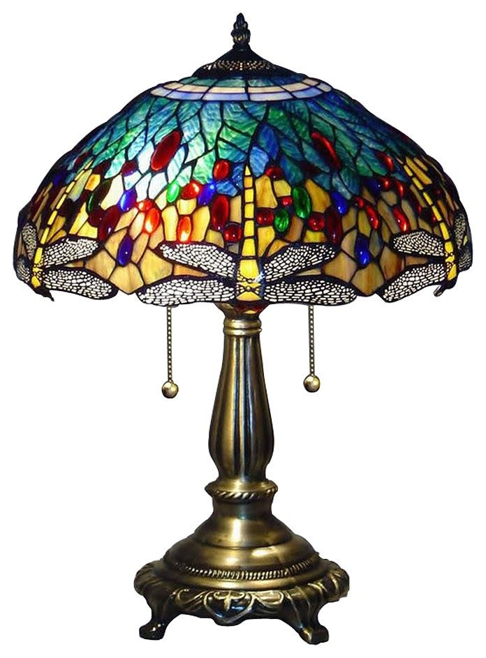 This unique Dragonfly Table Lamp has been handcrafted using methods first developed by Louis Comfort Tiffany. The shade contains pieces of stained glass, each hand-cut and wrapped in fine copper foil, in rich tones of blue. Yellow dragonflies accent the shade with red and green jeweled accents. The base has an elegant bronze finish.Base with its bronze finish makes for an aged quality lookThe lamp is 23" tall X 16" in widthEasy to use 2 pull chains for on/off lighting. Uses two 60-Watt bulbs and can use CFL or LED bulbs. Bulbs not included. UL listed.