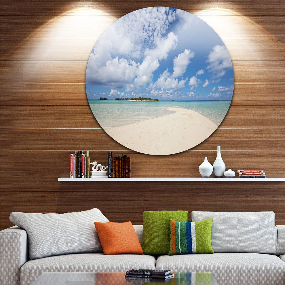 Bring Contemporary Abstraction to your home with this large Circle Metal wall art. This Serene Maldives Beach under Clouds Metal Artwork makes it the focal point of any room or office.