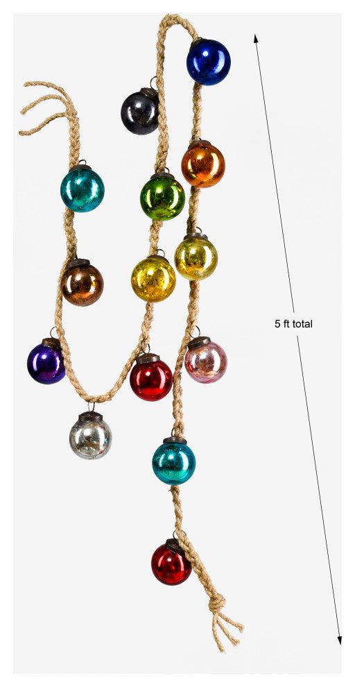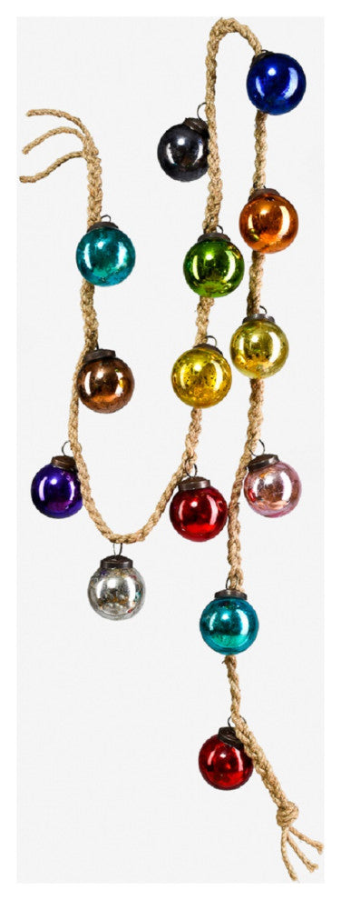 This garland features a beautifully woven jute rope that holds mercury glass ball ornaments in blue, purple, red, gold, silver, copper, and platinum colors. For your holiday decor at home, drape one or two garlands across a mantel, or hang the garland in a large window. Use the garland across the branches of your Christmas trees and adorn the tree with our matching mercury glass ornaments balls in a mix of colors. Complete the look with multicolor Christmas lights. Sold individually, measures 60" Long and 2" Diameter. Serene Spaces Living encourages easy DIY decorating and we hope these glittery ball ornaments will be a great addition to your holiday decor!
