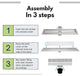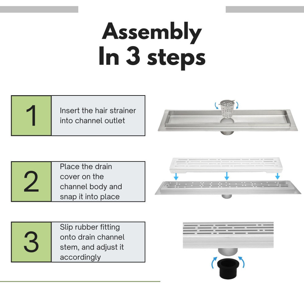 SereneDrains Linear Shower Drains - Traditional Square - Brushed Stainless SteelIncludesLinear Shower Drain Channel and Grate, Stainless Steel Hair Trap, Rubber Fitting and Grate Lifting Hook.Available Sizes (Approximate Dimensions)Length 16" (400mm), Intake 8.11 sq. in.Length 24" (600mm), Intake 12.59 sq. in.Length 30" (762mm), Intake 16.86 sq. in.Length 35.43" (900mm), Intake 20.02 sq. in.Length 39.37" (1000mm), Intake 22.35 sq. in.Length 47.25" (1200mm), Intake 26.68 sq. in.Length 59.05" (1500mm), Intake 34.26 sq. in.FeaturesHigh Quality MaterialsSereneDrains Linear Shower Drains are made of 16 Gauge SS304 Stainless Steel Flange and Channel. Brushed Steel Finish protects the Linear Shower Drain from corrosion & rust.Easy InstallationSereneDrains Shower Drains don"™t have leveling feet. This is much more stable and makes installation of the Linear Drain easy by simply allowing you to rest the Flange on the floor edge.Water and Leak ProofThe Flange of the Shower Floor Drain is designed for use with all waterproofing materials such as: "Hot-Mop", Liquid membranes, Sheet Membranes, Vinyl waterproofing etc.. Bodies are fully welded and leak tested prior to dispatch.Durable, Solid and Smooththe frame is rounded (folded, not welded). This creates a frame twice as strong and gives the Linear Shower Drain a smooth touch to the feet. NO plastic parts.Flange Edge Body DesignFolded, not welded. For maximum durability.For use with any and all types of waterproofing. Including "hot-mopping".Easier installation. Simply lay the flange on the channel. Keeps the drain stable and prevents it from moving, instead of having to adjust plastic leveling feet.Wheelchair Access(ADA Compliant) & Barrier-free showers.Technical- Channel width: 2 3/4" (70 mm).- Flow rate: at entrance to shower - 6.3GPM (0.4 l/s); against the wall - 9.5GPM (0.6 l/s).- Compatible with tiles up to 10mm depth (14mm lip).