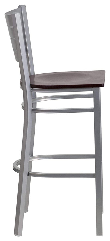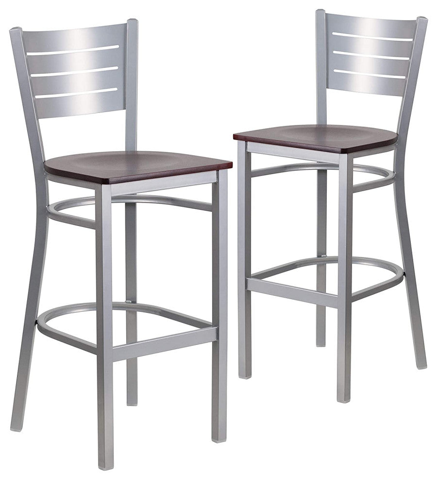 Set of 2 Bar Stool, Silver Metal Frame With Ladder Backrest, Mahogany Wood Seat