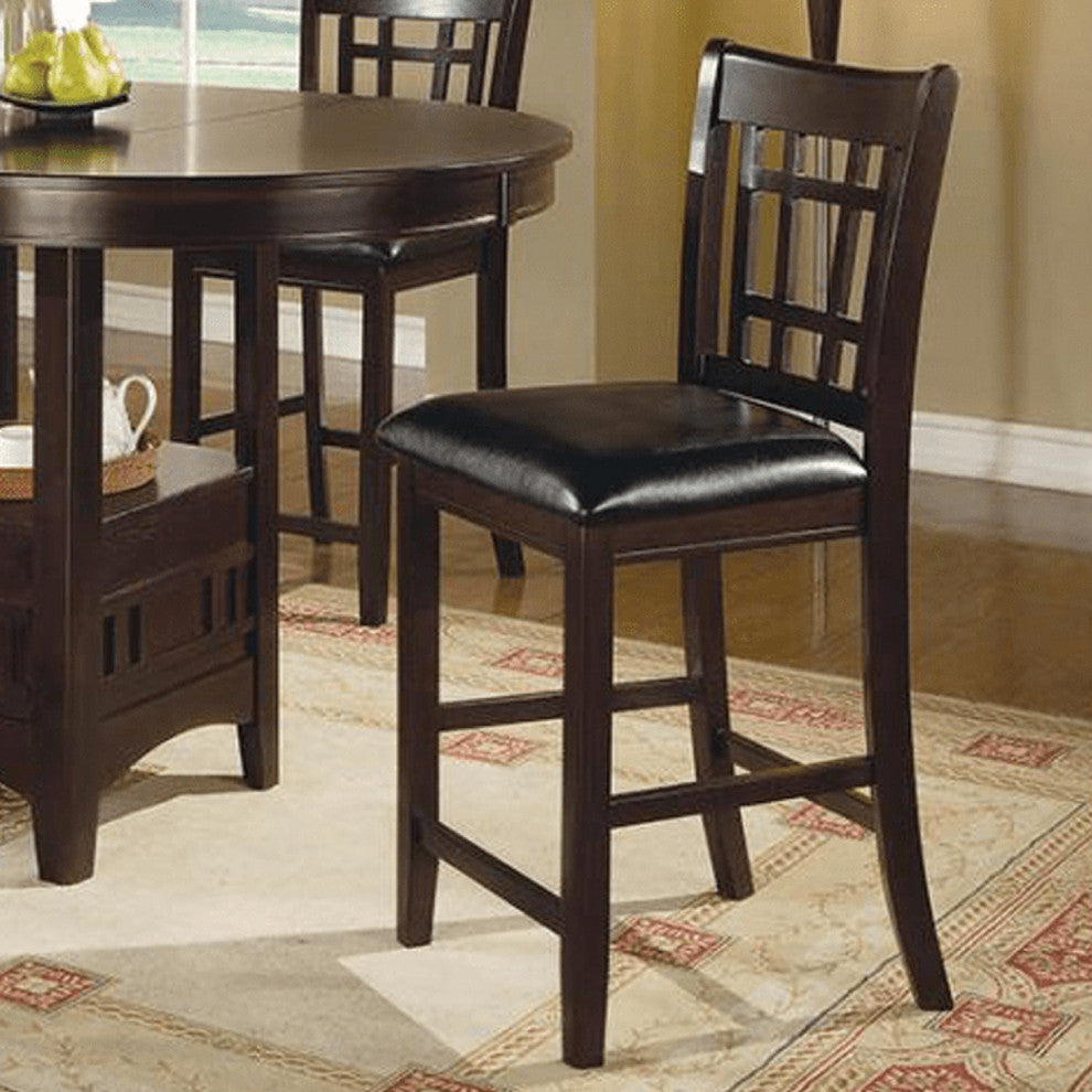 Pull this comfy chair up to your favorite table to relax and dine in style.This counter height chair is ideally suited for counter height table in the same color tone. Seat back features wood slats in rectangular pattern. Espresso finished leg has convenient footrest. Seat comfortably upholstered in black leatherette. Sit together with your family or friends, sidle up to the home bar for beer and conversation, this chair will bring you satisfied comfort.