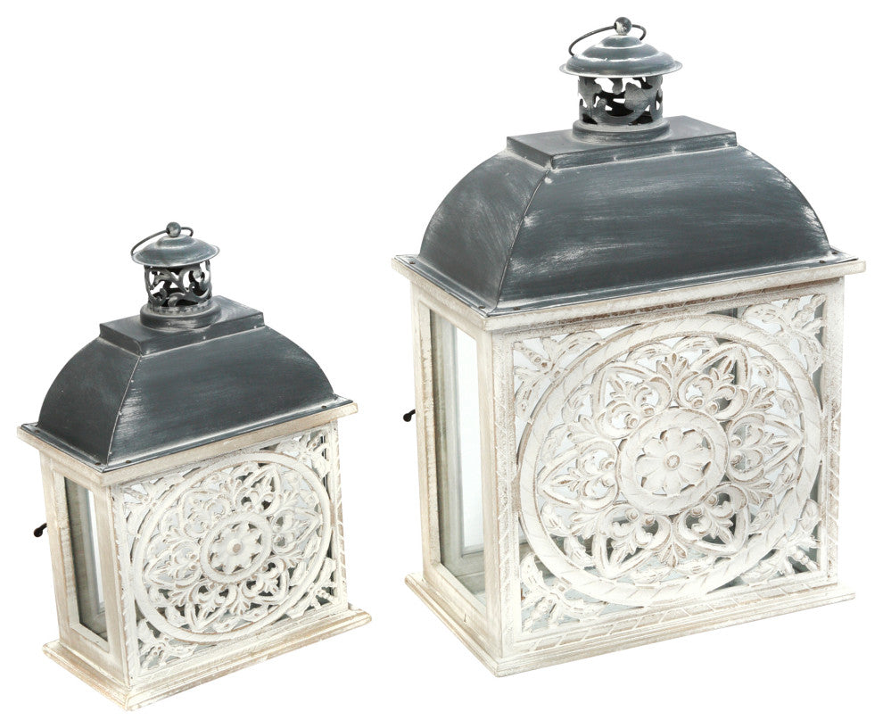 Add that special touch of elegant ambiance to your home with this classically-designed set of 2 lanterns. Set Contains 2 different Sizes: Large Lantern is 12.2InL by 7.5InW by 18.5InH, and Small Lantern is 8.7InL by 5.1InW by 13.4InH. Whether to use the intricately cut-out round floral design side as the front or as a backdrop to your glowing LED candles, not included, Silver metal steeple tops are a pretty accent to the white painted lanterns and allow you to easily hang these if desired. Filled with candles or your holiday decor, these will be a pretty centerpiece or table top display in your home decor all year.