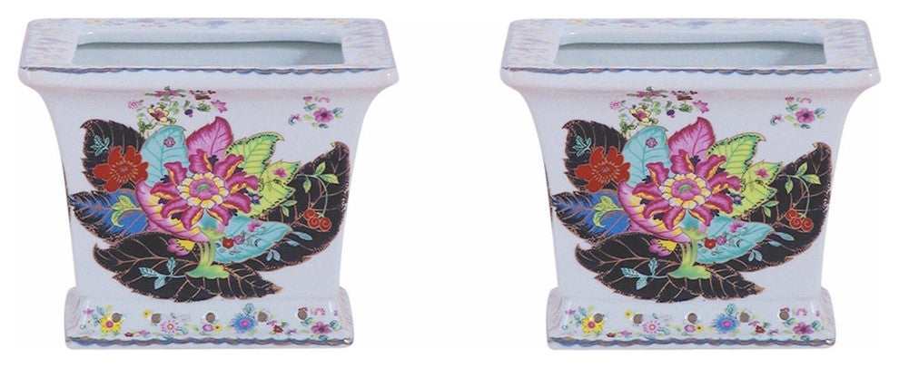 Set of 2 Tobacco Leaf Motif Square Porcelain Flower Pots 6"