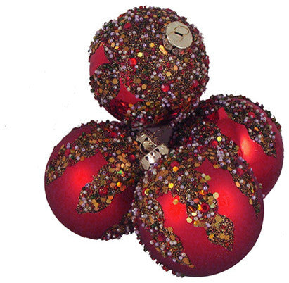 Red Christmas Ball Ornament Set | 4-piece set | Color: red | These dazzling ornaments are done in shiny and matte finishes with gold glitter and sequins | and colorful beads and gems | Shatterproof ornaments combine the beauty and luster of real glass with the unbreakable practicality of plastic | Balls are equipped with gold ornament caps for hanging | Dimensions: 3.25" (80mm) diameter | Material(s): plastic/glitter