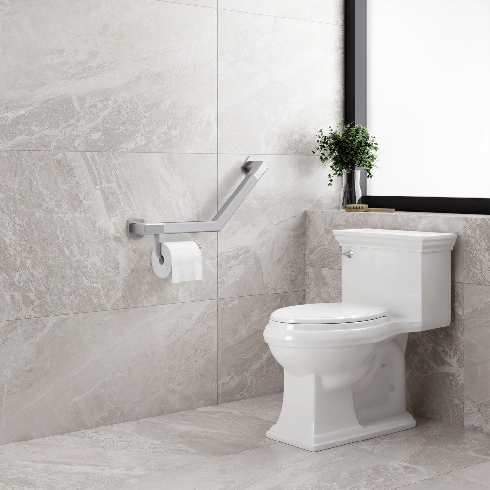 Introducing the Seville Collection by PULSE ShowerSpas. Recognized by top designers, the Seville Collection brings a fresh take on bathroom safety. The Seville Angle Bar by PULSE ShowerSpas is a state-of-the-art concealed screw grab bar designed to surpass ADA standards with uncompromising quality and functionality. The innovative ergonomic soft grip offers a secure handhold for users of all abilities, promoting safety and confidence in the bathroom. The optional toilet paper holder included ensures essential items are within reach, enhancing the convenience and usability of your bathroom space. Engineered with an industrial-grade build, the Seville Angle Bar is an ideal choice for both residential and commercial settings. Experience the timeless elegance of the Seville Collection, where style meets safety with the trusted assurance of PULSE.