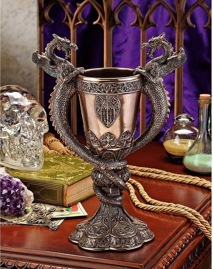 Summoned from the realm of highest fantasy, dual dragons protect this Toscano original that begs to become your highly prized Gothic centerpiece. Perfect for setting the mood for your altar rituals, spells and ceremonies, this finely turned work of decorative art is cast in quality designer resin and hand-painted in faux metallic tones. For display use only. 9"Wx5"Dx12&frac12"H. 3 lbs.