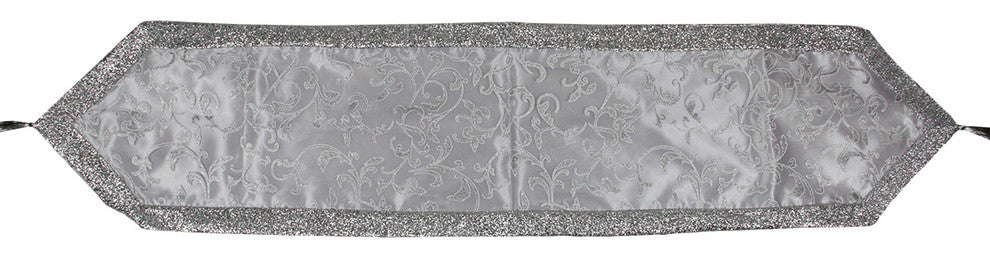 16" x 72" Silver Sheer Organza Glitter Print Runner with Metallic Border and TasselsMaterial: 100% Polyester