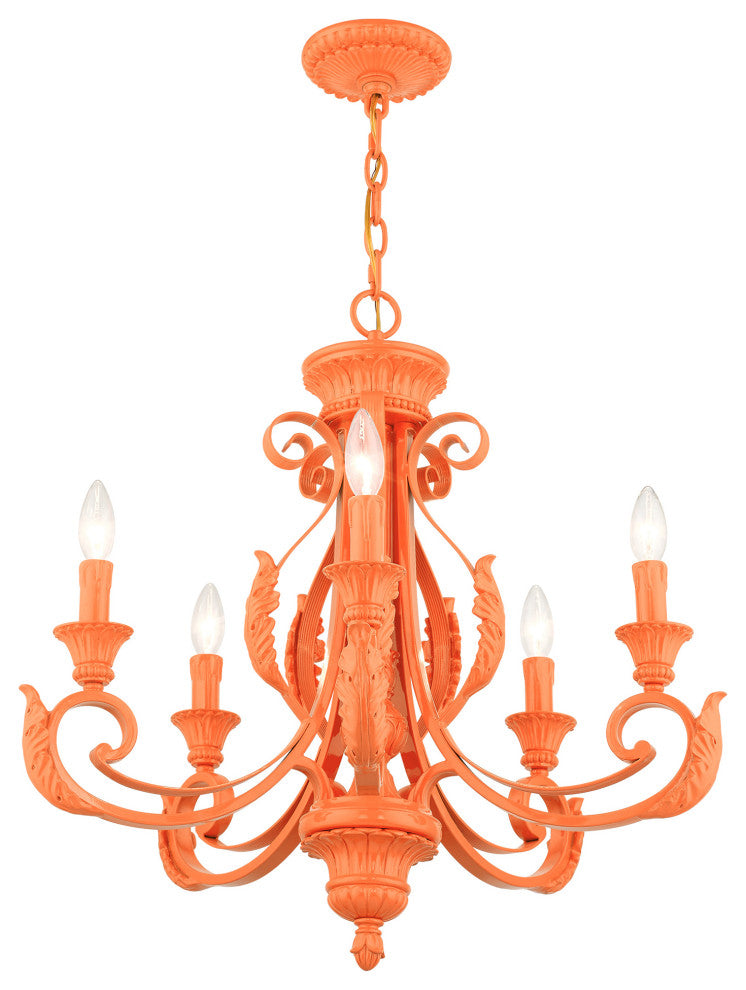 The Valencia is a classically inspired fixture with an overlapping leaf pattern and graceful curves. It is reminiscent of a European trestle though the elements of this piece are beautifully rendered in a shiny orange finish, which creates a much more contemporary feeling. This five-light chandelier is perfect for any interior design style. Suspended in your living room, dining room or bedroom, this light will add glamour to your life.