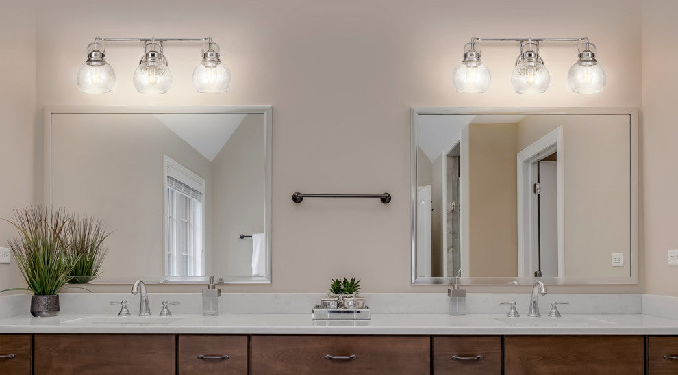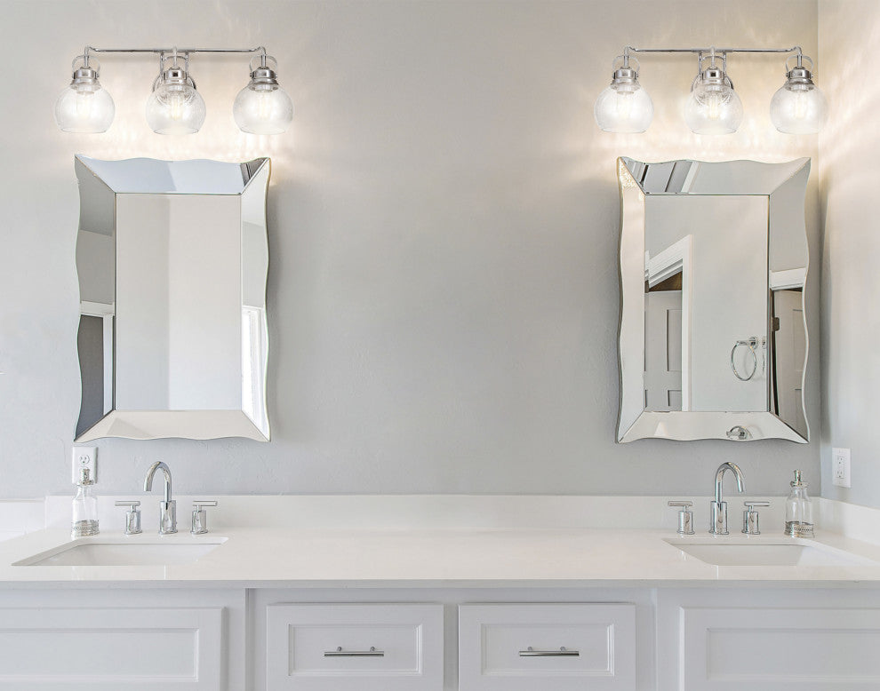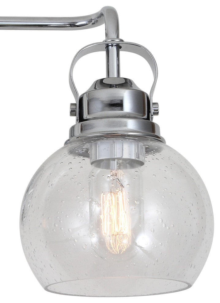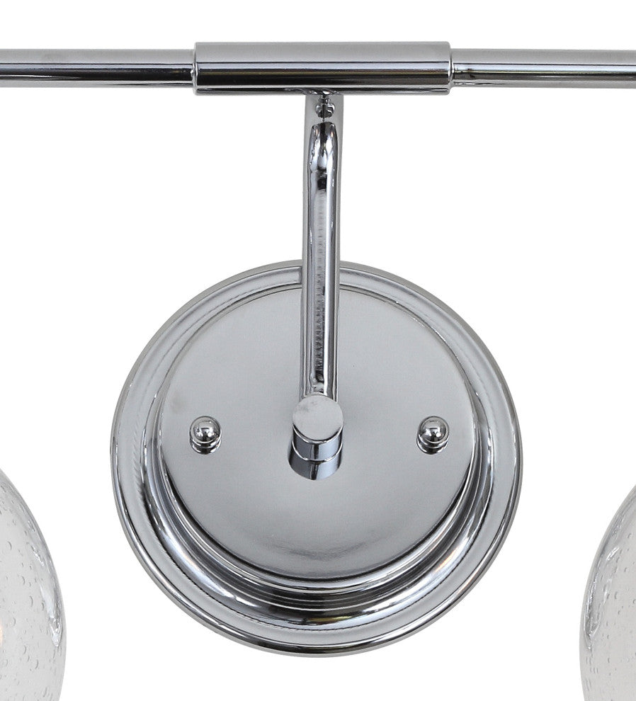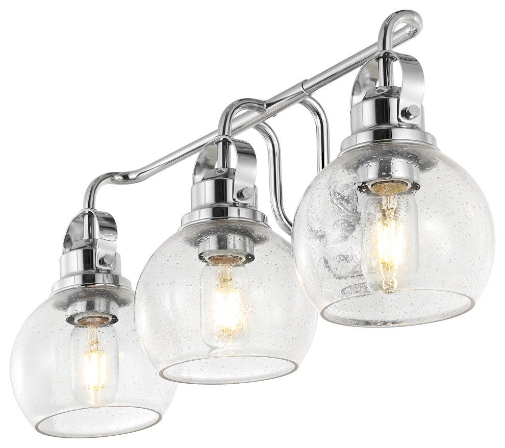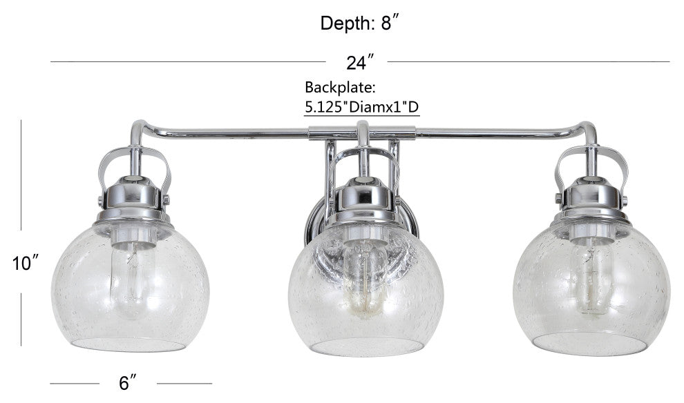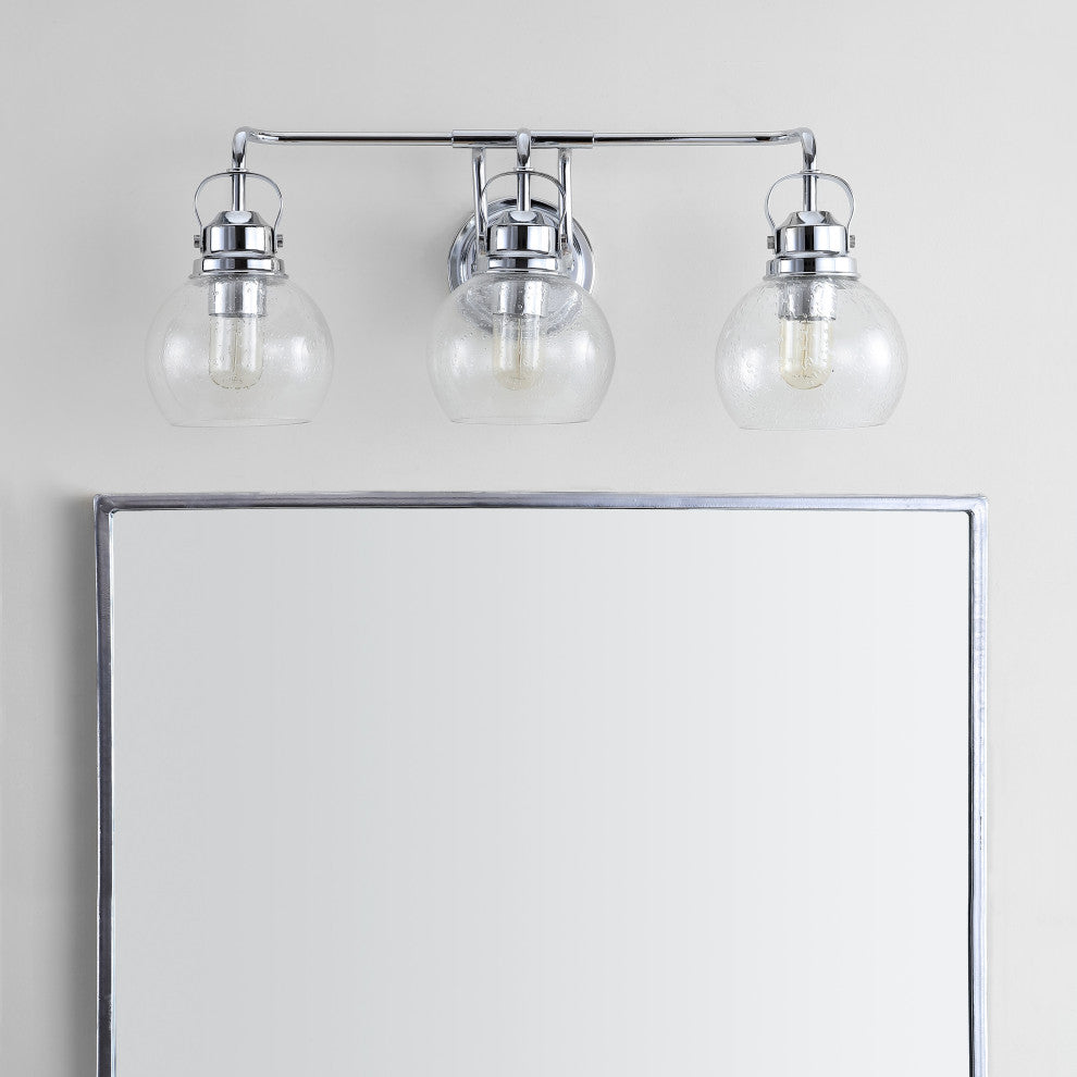 Much like the lanterns hung on New England shores to signal sailors home on summer nights, this globe sconce design adds a welcoming touch to a bathroom or hallway space. In chrome and glass, the materials are built to withstand humidity and frequent use, while the design is equally functional with LED compatible wiring. In clear bubbled glass, you''ll get a strong glow for your vanity or bathroom space. Features:Hanging glass globes add classic style to this bathroom sconce Takes three bulbs and compatible with any 9W LED or 40W Type "A" or 13W CFL25W Edison bulb includedAs this fixture must be hardwired, we recommend a professional electrician manage installationETL ListedColor: Chrome / ClearBody Material: Metal/GlassIncludes: One (1) lamp(s)Assembly RequiredDimensions:Lamp: 10 inches high x 24 inches wide x 8 inches deepAbout us:You see a lamp.We see a decorative work of art.A perfectly curved shade casts a dramatic shadow on a floor. A silk cord you never want to hide. LED lightbulbs: as easy on the environment as they are on the eyes. The JONATHAN Y Lighting collection considers every detail from impeccably sourced materials to designer styling. And our prices are so attractive, we''ve transformed a functional necessity into a fashion accessory.JONATHAN Y Lighting - a fashion revolution in home decor.