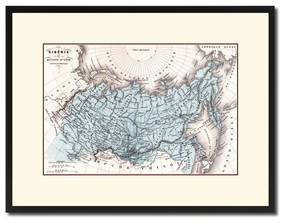 Siberia, Russia Vintage Map Print On Canvas With Picture Frame 16" X 21"