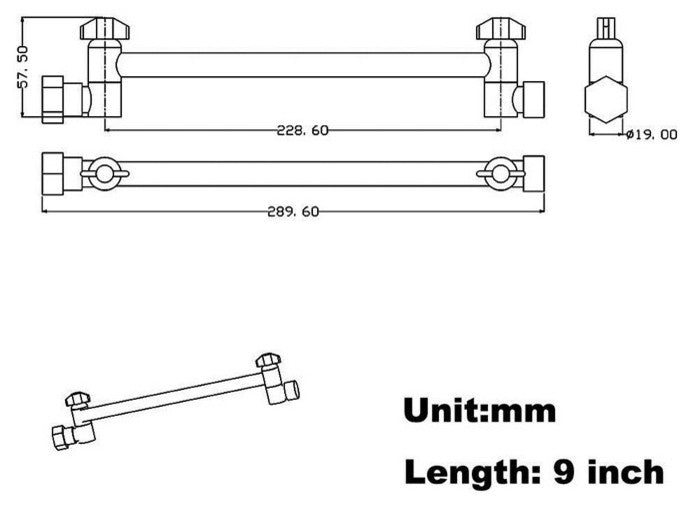 Made of high-quality brass with long-reach threads and an internal mechanism designed to prolong the life of your adjustable-height shower arm. The Adjustable-height Shower Arm lets you enjoy overhead rain shower heads, without a lot of expensive plumbing! Simply attach your favorite shower head. And if your showerhead is too high - or if your shower head is too low - this unique device lets you quickly raise and lower your showerhead to the height you want. Easily allows a height adjustment up to 17 inches! Simply adjust up or down, and tighten the nuts as necessary. Each arm measures 9-3/4 inches end-to-end; 9-1/8-inches from the center of each joint. Shown with shower supply pipe (not included)