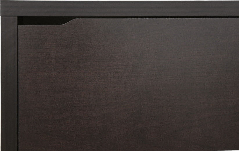 Stash your shoes stylishly in our Simms Shoe Cabinet. This modern shoe storage solution was designed with a low profile, svelte size as to fit neatly against a wall in a hallway, mud room, or entryway. Three storage compartments each fit six pairs of shoes comfortably for a total of approximately eighteen shoe slots, which varies depending upon your shoes sizes. The unit is made in Malaysia with an engineered wood frame, dark brown faux wood grain paper veneer finish, plastic door supports, and silver plastic legs. The Simms Shoe Cabinet requires assembly and should be dry dusted. Other sizes and colors are also offered (sold separately). Dimensions: 52.6 inches high x 31.2 inches wide x 9.1 inches deep.