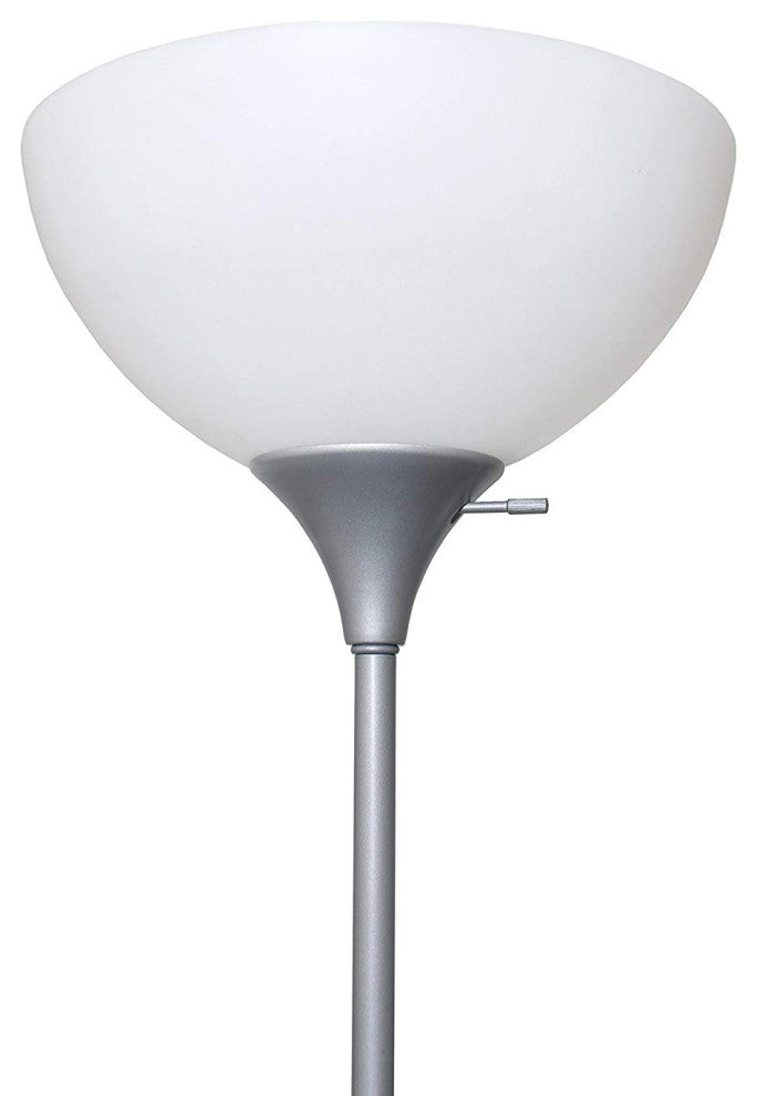 Simple Designs Floor Lamp with Reading LightA charming, inexpensive and practical floor lamp to meet your basic lighting needs. This simple mother/daughter floor lamp with reading light features a painted finish and plastic white shades. Perfect for living room, bedroom, office, kids room, or college dorm.Painted FinishWhite Plastic ShadesFloor lamp uses 1 X 100W 3-way type A medium base bulb (not included) Reading light uses 1 X 60W type A medium base bulb (not included)L: 15.5" x W: 11.35" x H: 71.5"Perfect for living room, bedroom, office, kids room, or college dormSome assembly requiredETLBulb Type: IncandescentSwitch Type: RotarySwitch Location: Floor Light is on LampReading Light is on ShadeShade Diameter: Large shade 11.35"Small shade: 6"Shade Security: Socket NutNumber of Lights: 2Maximum Wattage: 100Shade Material: PlasticCord Color: BlackFinish/Color: SilverPrimary Material (Leather, Metal, Wood): MetalBase Type: E26 Medium BaseHeight from Base to Shade: Main: 67"Reading: 50.5"Bulb Included: NoWe don''t sale in California