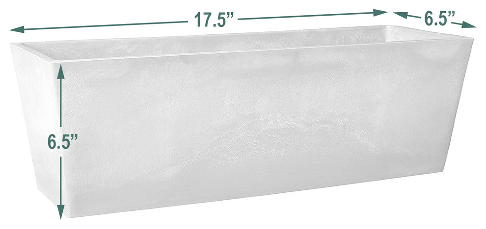 Part of our award-winning PSW Pot Collection, the Simplicity Window Box from Arcadia Garden Products is made from a mix of recycled plastic, stone powder, and wood dust. With the substantial look of cement, this durable but lightweight planter is low and wide. Its window box shape is popular for planting and displaying in outdoor gardens, on patios and porches and inside the home. Planted with flowers and foliage this indoor/outdoor container is sure to capture attention. Slight variations in the appearance of each planter give the finish nearly a hand-crafted look. Grand enough to be positioned in a commercial setting such as a restaurant or office lobby, this sturdy planter is available in two colors and two sizes. Planted or plain, the handsome container also makes a thoughtful gift for gardeners and those who delight in home decorating. The winning combination of recycled ingredients in the PSW line makes this an attractive, eco-friendly product, which is also weather resistant and easy to clean. If used outdoors, the bottom of the planter indicates the ideal area for easy drilling. Coordinate the Simplicity Window Box with other PSW containers and count on enjoying long-lasting products in your home, garden, patio or porch. LIGHTWEIGHT & DURABLE: When the look and durability of a concrete planter is wanted without the unyielding weight and breakability factor, this PSW window box-shaped planter fits the quest. It"™s well-crafted while notably lightweight. RECYCLED MATERIALS: A blend of recycled plastic, stone powder and wood dust is used to create this concrete-looking planter. PSW products are both attractive and eco-friendly, making them popular with environmental-minded gardeners.ORIGINAL: The unique appearance of each PSW product is one-of-a-kind due to the blending of recycled materials. The slight variations in the finish infer an artisan"™s touch, making these planters appealing and functional. WEATHER RESISTANT: Through snow, sleet, rain or heat "“ this item can withstand extremes. UV rays won"™t fade this item so count on it to be long-lasting. PSW plant containers are for use indoors and outside. PROTECTIVE: Water spills from over-doused houseplants can ruin surfaces. This planter does not leak and safely contains moisture for potted ferns, foliage, and flowers. For outdoor use, this container can easily be drilled to allow for drainage. VARIETY: Having choices makes a difference when creating a certain look in your garden or indoor plants area. PSW products are available in a variety of sizes and colors to complement your existing gardenscape or to create a new garden or patio look.