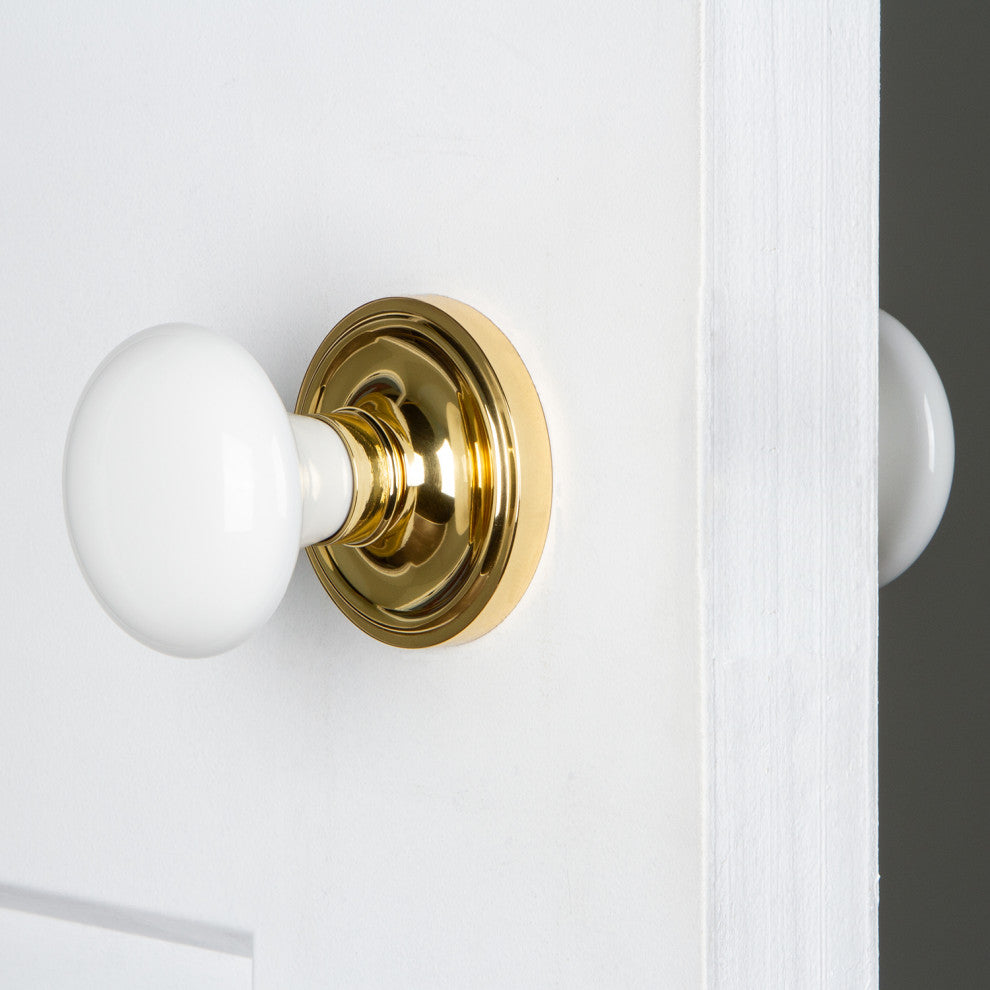 The simple elegance of the Classic Rosette in Unlacquered brass offers beauty and durability that will compliment a variety of architectural styles. Add a traditional touch with our pure White Porcelain Knob for a simple, yet vintage, look. All Nostalgic Warehouse knobs are mounted on a solid (not plated) forged brass base for durability and beauty.