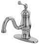 This bathroom faucet features aesthetic colonial elegance with its graceful, round curves and Victorian style spout. This faucet has a deck mount setup and features a 4" centerset installation with optional deck plate. The body is fabricated from solid brass for durability and long-lasting use. The color finish is made of polished chrome for that reflective shine, as well as resisting scratches, corrosion and tarnishing. The spout has a reach of 6-7/8" and a height of 6-5/8". The handle allows for easy management of water volume and temperature. The faucet operates with a ceramic disc valve for droplet-free functionality with the water measured 2.2 GPM (8.3 LPM) and a 60 PSI maximum rate. An integrated removable aerator is inserted beneath the spout''s head piece for conserving water flow. A push-up drain in a matching finish is included. All mounting hardware is included and standard US plumbing connections are used. A 10-year limited warranty is provided to the original consumer.. Manufacturer: Kingston Brass. Model: KS1401BL. UPC: 663370039959. Product Name: Single Handle 4" Centerset Lavatory Faucet with Push-Up & Optional Deck Plate. Collection / Series: Heritage. Finish: Polished Chrome. Theme: Classic. Material: Brass. Type: Faucet. Features: Drip-free ceramic cartridge systemMatching push-up drain included6-7/8" spout reach6-5/8" spout height4" spout clearance