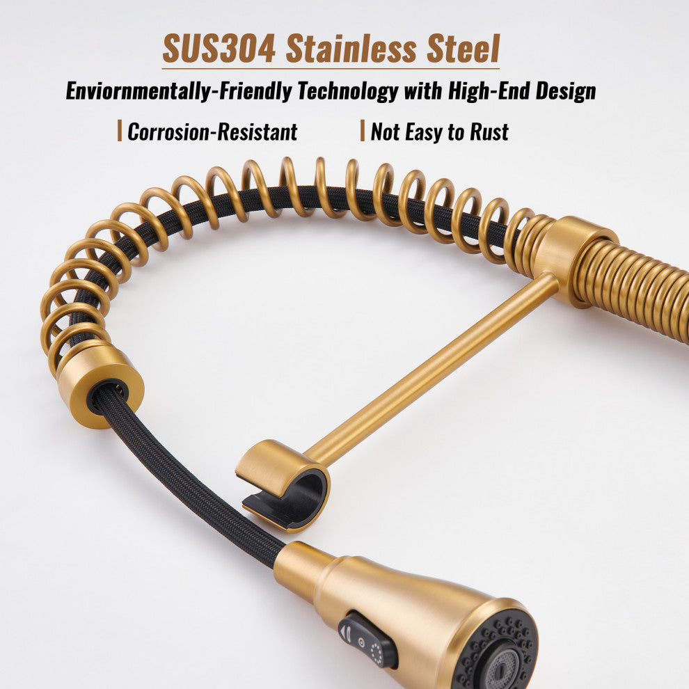 Single Handle Kitchen Faucet Pull-Down Sprayer, 360 Swivel, Three Functions, Brushed Gold