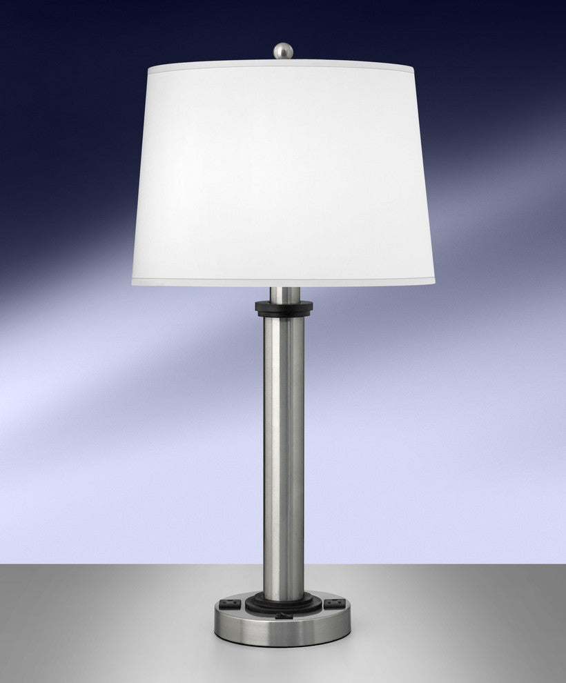 Standard Lamp Specifications for #WB461:Product Type: Single Nightstand LampHeight: 28"Finish: Brushed Steel/Black Construction: Steel/ResinSocket: (1) Aluminum On/Off Med. Base Type A 150W Max socket(s). (Bulb not included)Switching: (1) On/Off Rocker switch(es) located on the base.Cord: 6''5'' (from base) long black 16 gauge cord set with a 3 prong grounded plug.Electrical Outlet: (2) 3 prong grounded outlet(s).Data Port: None.USB Port: None.UL/CUL and/or ETL listed: YesHarp Size: 8 inches (including the saddle)Standard Packing: 2 per carton (shade packed separately).Lamps & Shades per SKU: 1Lamping: (1) Aluminum On/Off Med. Base Type A 150W Max socket(s).Shade Size and Description: White fabric laminated to styrene hardback drum with self fold trim measuring 12" x 14" x 10" w/ .5" drop (Top x Bottom x Slant).Bulb Included: NoMaterial Description: constructed from polished, plated, and lacquered steel.