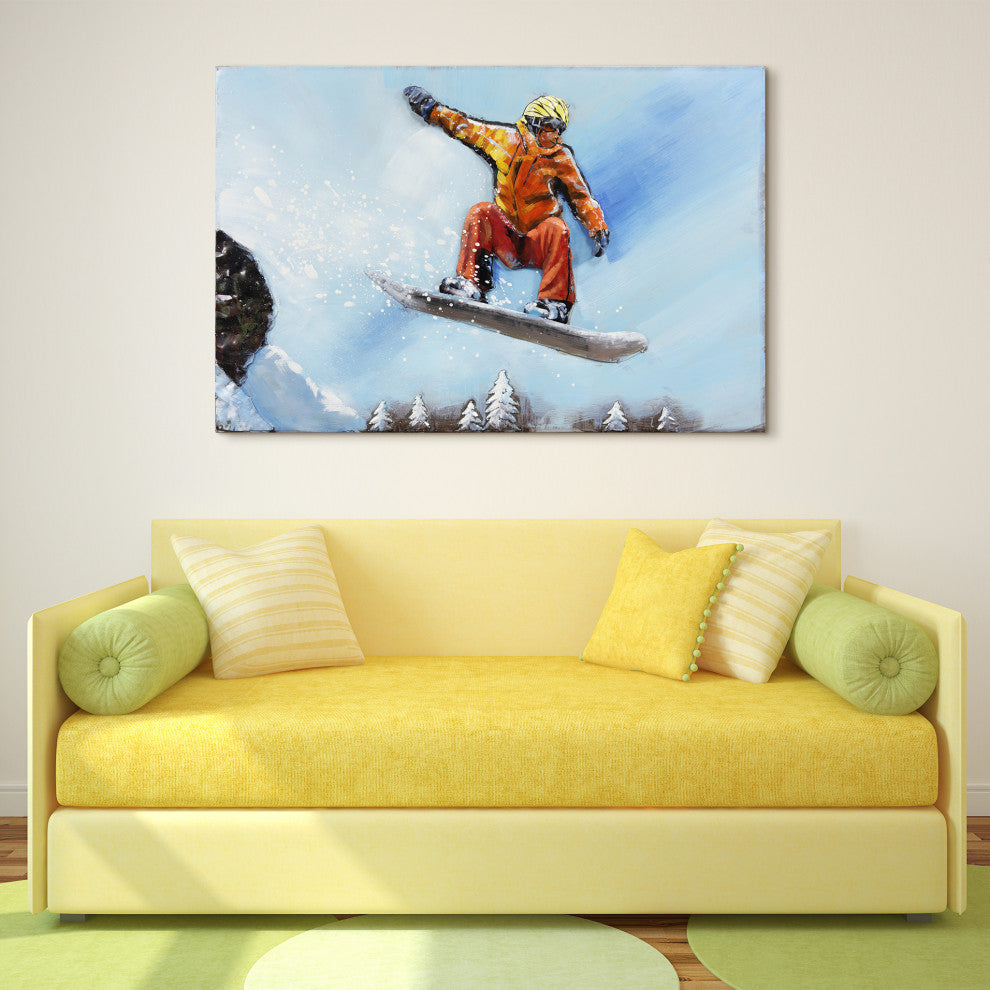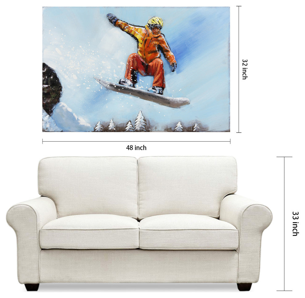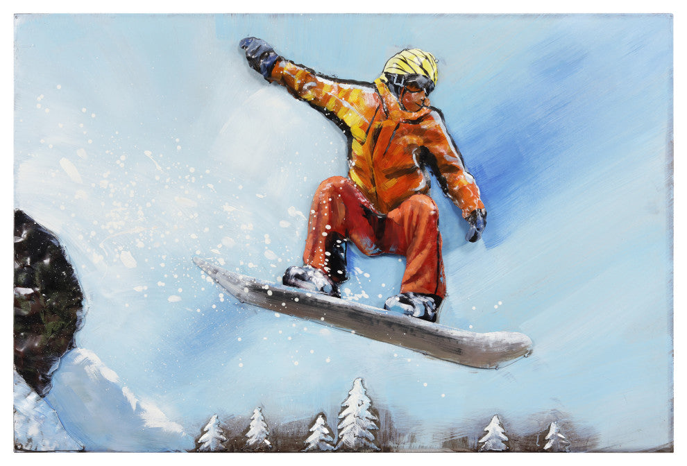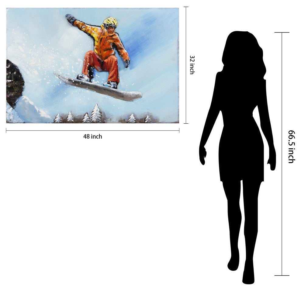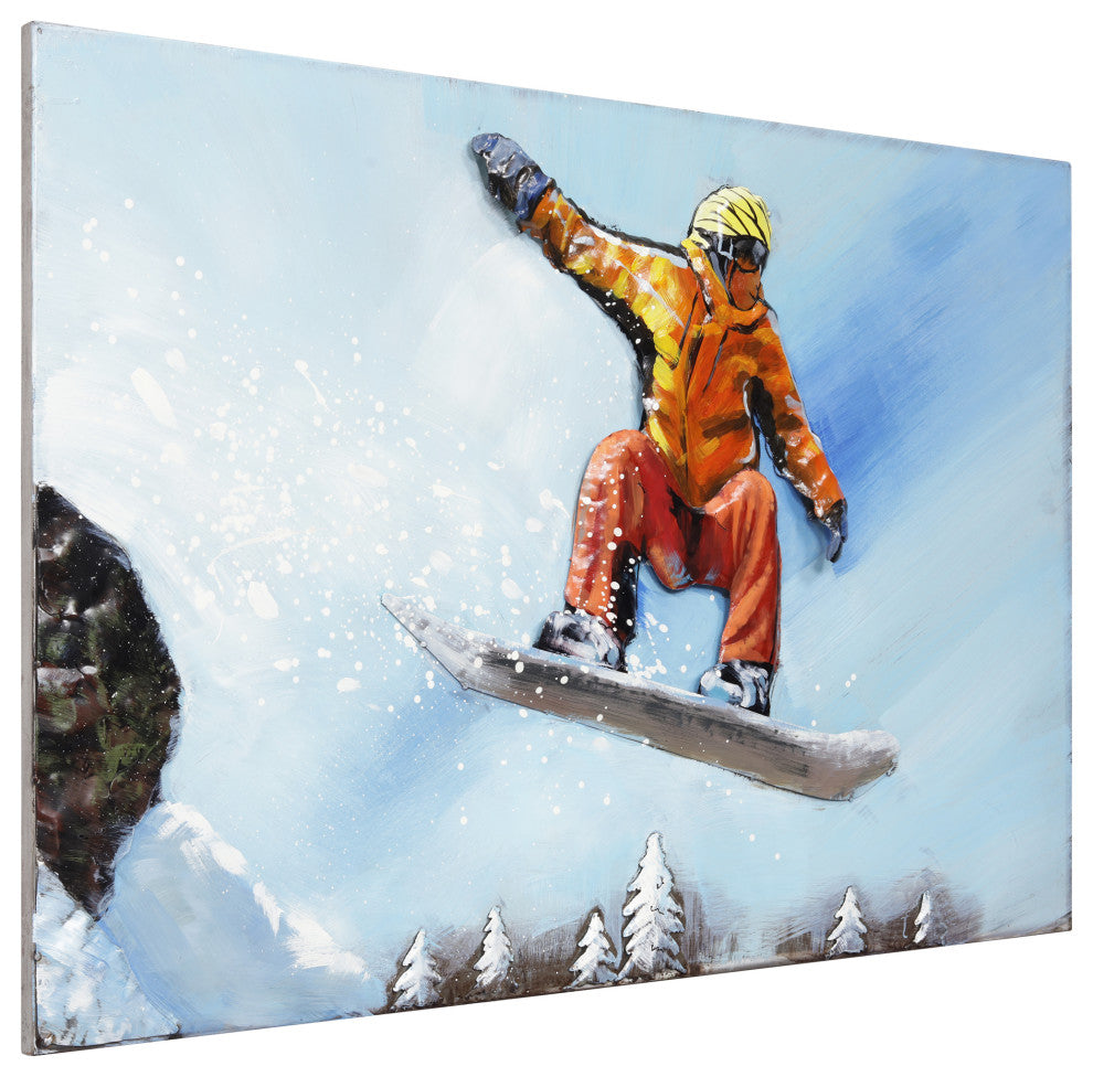 Empire Art Direct and their exclusive artist Primo are proud to present this three-dimensional, iron, mixed media wall sculpture. These individual unique originals are hand painted and signed works of art that are renown for Primo''s skills of manipulating iron into a textured work of art with extraordinary depth and skill. This 3D sculpture of a snowboarder flying though the air can be presented outdoors if it is varnished every year, as it will take on a patina characteristic that is inherent in its presentation.