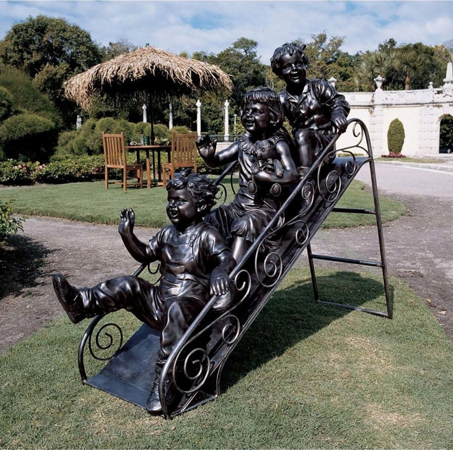 We can almost hear the giggles as this nearly life-size young trio careens down childhood''s slide as the signature piece in your garden. Not missing a detail, from wind-blown hair to chubby cheeks, the artist captures a spirit of pure joy. Cast in high-quality designer resin with a hand-crafted metal slide finished in a faux bronze patina, this large-scale sculpture is virtually indistinguishable from a gallery bronze. Simple assembly required. 60"Wx19.5"Dx46"H. 101 lbs.