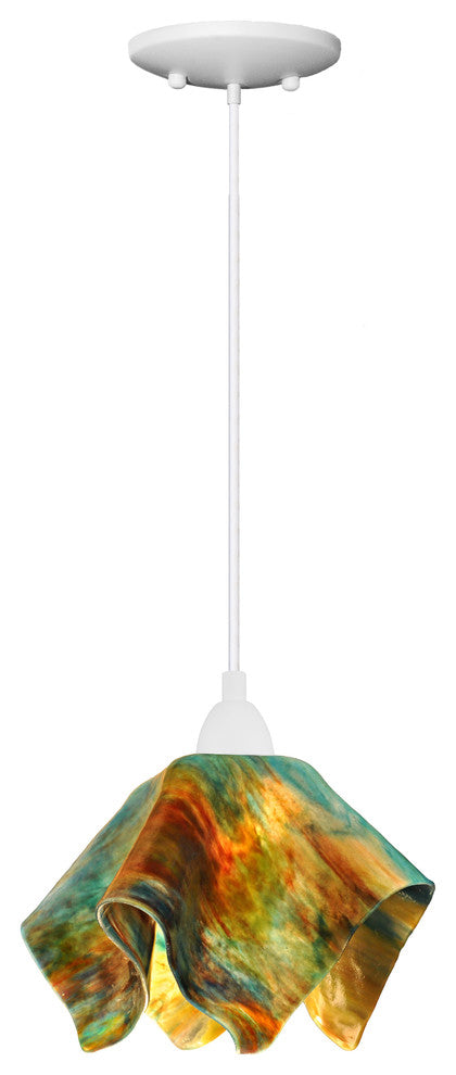 Jezebel Signature glass exudes romantic ambiance with color. Signature glasses have a rich waxy feel and stone-like texture and appearance. The Signature glasses are more luminous, richer in color and eliminate unsightly light bulb hot spots. Jezebel holds the patent on her technique. And, because the color is inside the glass and not painted on the surface, there is a remarkable 3-dimensional effect while light is diffused throughout the glass. The complex mixture of colors is difficult to attain in glass. Jezebel Signature glass surpasses any other for lighting, even that which Louis C. Tiffany made and became famous for from 1878-1938.Jezebel Signature Pendant Lights are made in the USA of handcrafted glass using a process patented to Jezebel. The remarkable three-dimensional effect can be ordered in a variety of glass colors. All Jezebel Signature products are UL certified and 120 Volts. This light can be used with a medium base bulb (not included): Incandescent, Fluorescent or LED. Naturally occurring air bubbles, inclusions, textures and slight color variations demonstrate that your Jezebel Signature Pendant Light is an original work of art. Your Jezebel Signature Pendant Light comes with our 90 day limited warranty. If your hardware or glass shade arrives defective in any way, please contact your retailer for claim instructions. Comes with 4.5 feet of adjustable cord, glass measurements are 5"H x 8.5"W x 8.5"D, the ceiling cap measurements are 1 5/8th" high, 5 1/8th" diameter.This light can be used with a medium base bulb (not included): Incandescent, Fluorescent or LED.The wiring is 120 volts.