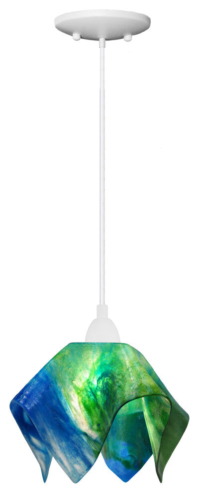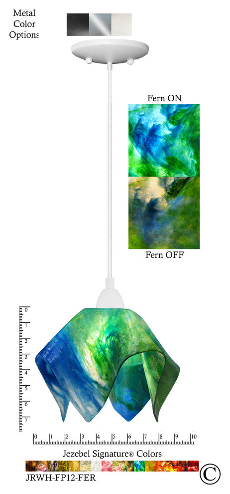 Jezebel Signature glass exudes romantic ambiance with color. Signature glasses have a rich waxy feel and stone-like texture and appearance. The Signature glasses are more luminous, richer in color and eliminate unsightly light bulb hot spots. Jezebel holds the patent on her technique. And, because the color is inside the glass and not painted on the surface, there is a remarkable 3-dimensional effect while light is diffused throughout the glass. The complex mixture of colors is difficult to attain in glass. Jezebel Signature glass surpasses any other for lighting, even that which Louis C. Tiffany made and became famous for from 1878-1938.Jezebel Signature Pendant Lights are made in the USA of handcrafted glass using a process patented to Jezebel. The remarkable three-dimensional effect can be ordered in a variety of glass colors. All Jezebel Signature products are UL certified and 120 Volts. This light can be used with a medium base bulb (not included): Incandescent, Fluorescent or LED. Naturally occurring air bubbles, inclusions, textures and slight color variations demonstrate that your Jezebel Signature Pendant Light is an original work of art. Your Jezebel Signature Pendant Light comes with our 90 day limited warranty. If your hardware or glass shade arrives defective in any way, please contact your retailer for claim instructions. Comes with 4.5 feet of adjustable cord, glass measurements are 5"H x 8.5"W x 8.5"D, the ceiling cap measurements are 1 5/8th" high, 5 1/8th" diameter.This light can be used with a medium base bulb (not included): Incandescent, Fluorescent or LED.The wiring is 120 volts.