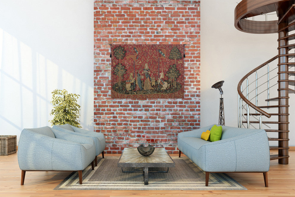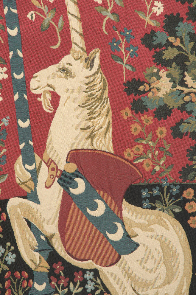 Smell European tapestry is one of the six tapestries in the "Lady and the Unicorn" series. This tapestry represents the sense of smell. The lady stands, making a wreath of flowers. Her maidservant holds a basket of flowers within her easy reach. Again, the lion and unicorn frame the lady while holding on to the pennants. The monkey has stolen a flower which he is smelling, providing the key to the allegory.Please note: Rods and tassles not included.